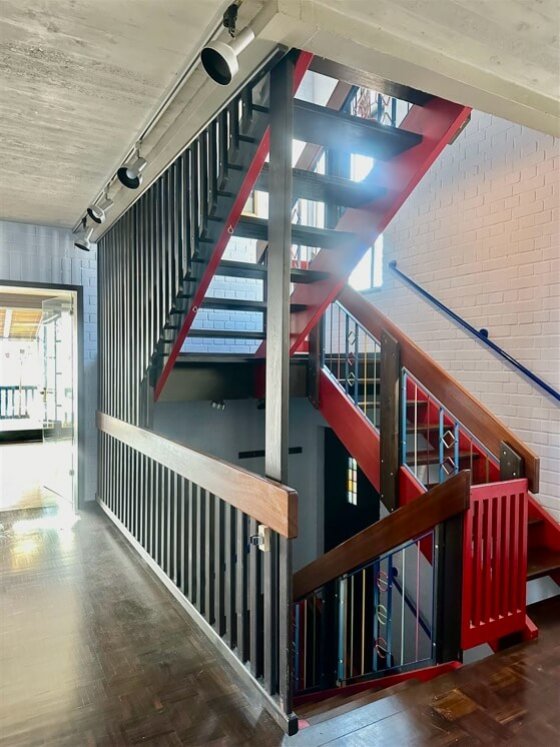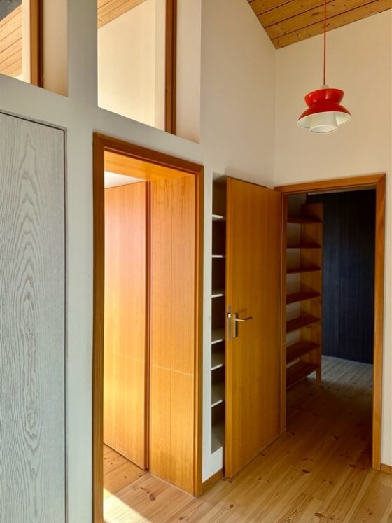 Das besondere Treppenhaus bildet ein ansprechendes Gestaltungsmerkmal durch das gesamte Haus. Die Erdgeschossebene liegt leicht erhöht und wird von der Haustüre aus über eine ‚halbe‘ Treppe erschlossen. Das gesamte Obergeschoss hat keine Zwischendecke und öffnet sich somit bis zum Dach.