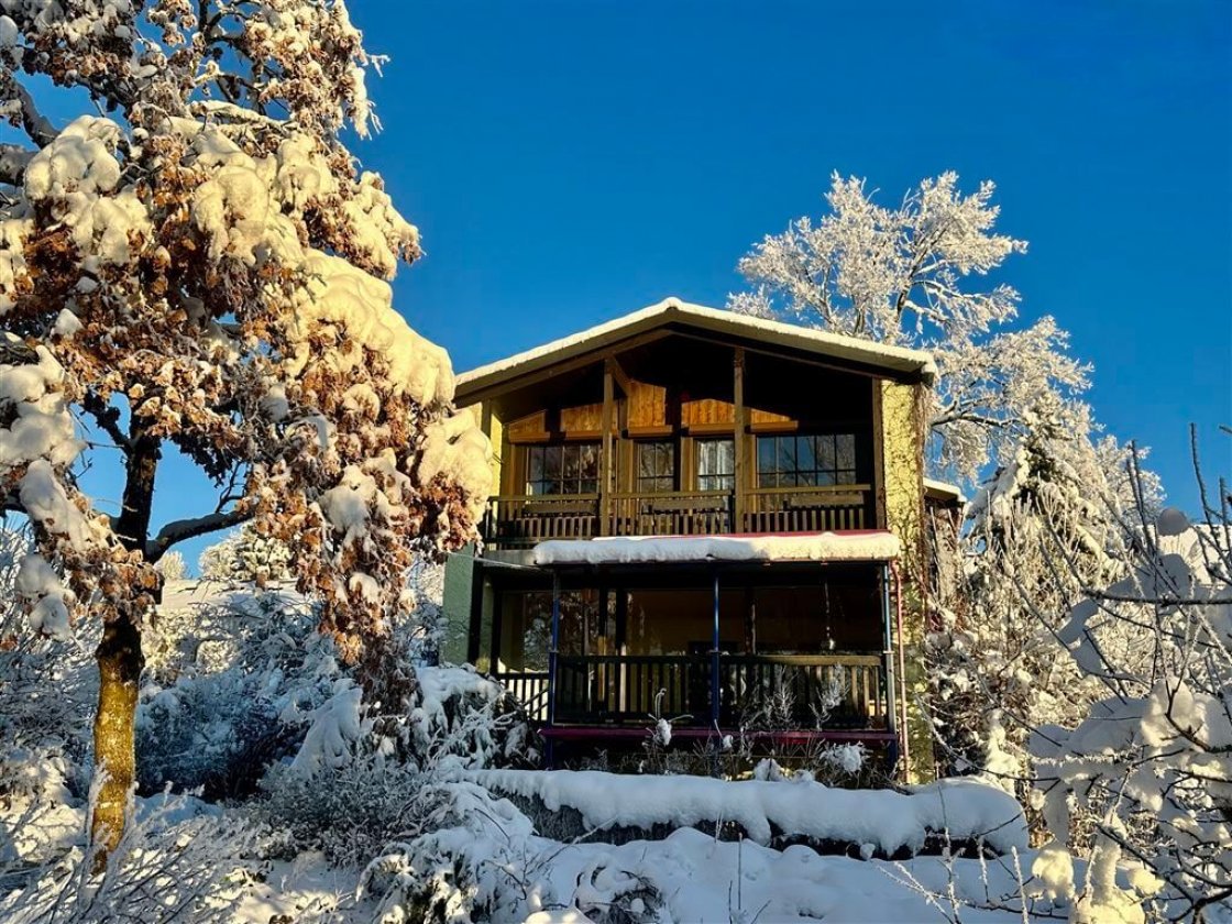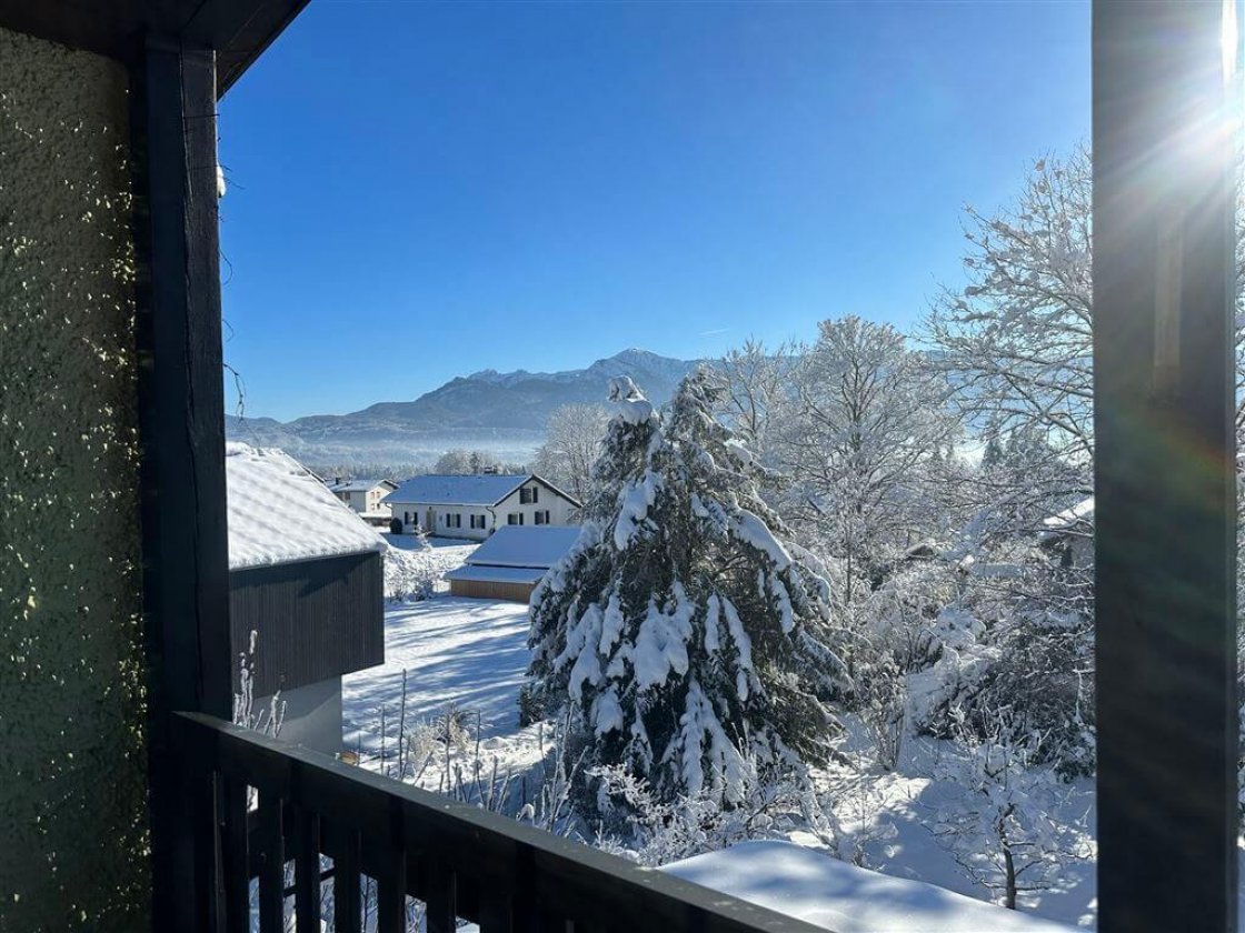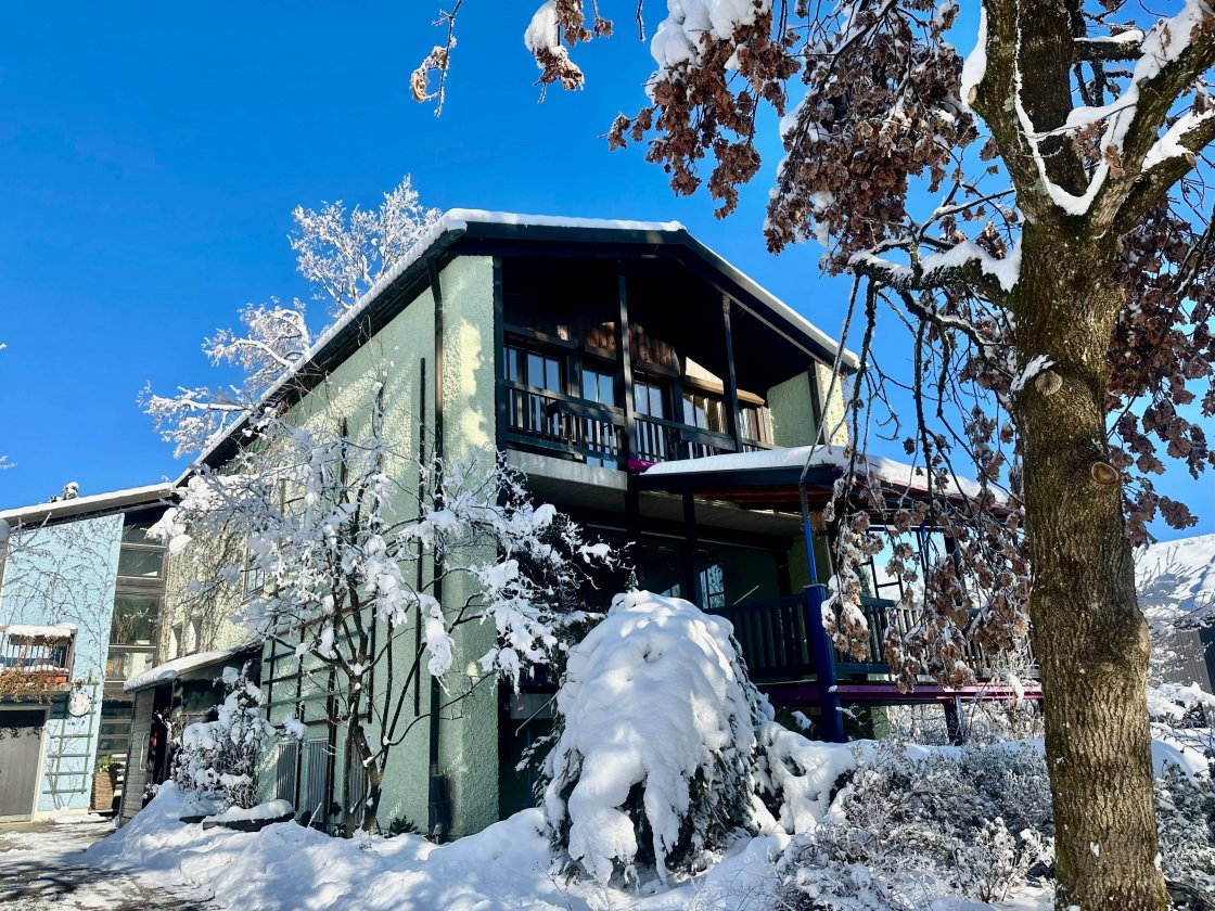 Das Haus besteht aus zwei versetzt aneinander gebauten Baukörpern. Der nach Süden ausgerichtete Balkon bietet eine herrliche Aussicht in den Garten und Richtung Osten auf die Berge.