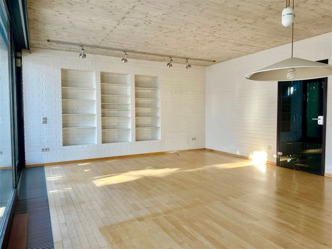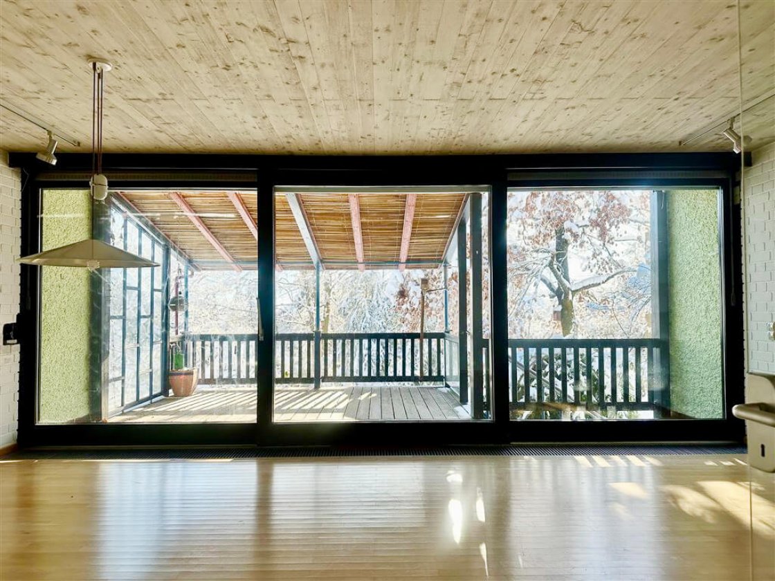 In den Jahren 1972 bis 1974 entstand dieses besondere Haus mit zwei versetzt aneinander gebauten Baukörpern, dem Hauptwohnhaus und dem Nebenwohnhaus mit Einliegerwohnung. Das Hauptwohnhaus erstreckt sich über drei Etagen: Erdgeschoss, Obergeschoss und Kellergeschoss. Das Obergeschoss ist dabei ohne Zwischendecke offen bis zum Dach ausgeführt. Das Kellergeschoss verfügt aufgrund der Hangbauweise über ausreichende Belichtung und kann ideal als Gäste- und oder Bürobereich genutzt werden.