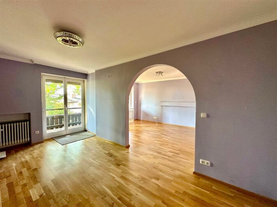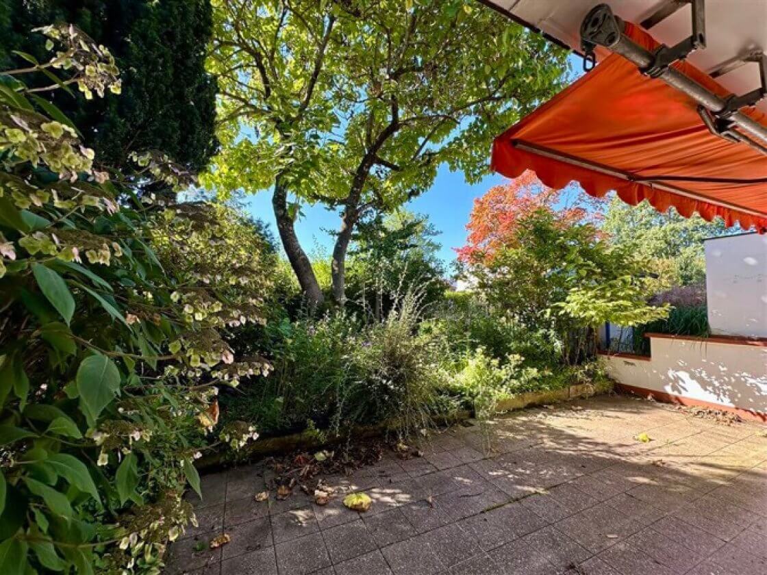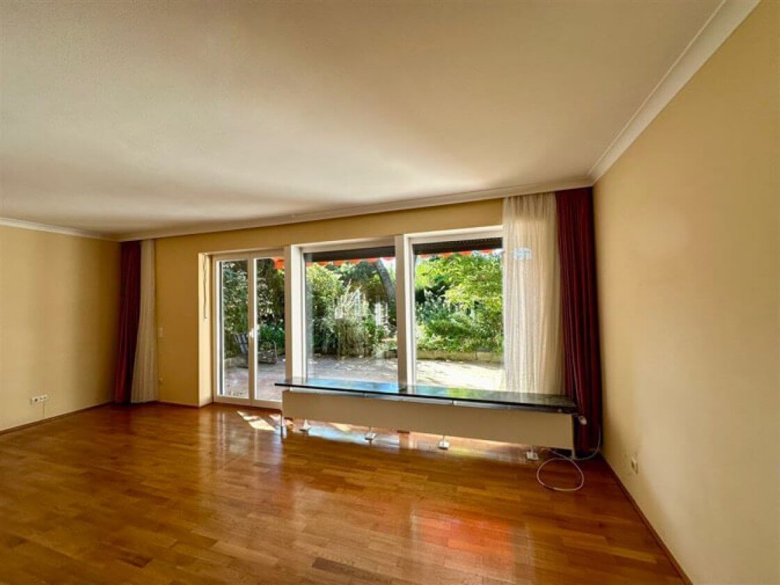 Von der großzügigen Diele mit Gäste-WC und viel Platz für die Garderobe erschließt sich der Wohnbereich. Die Küche ist Richtung Osten ausgerichtet und derzeit mit einer nicht tragenden Wand vom Essbereich abgetrennt. Die beiden Bereichen lassen sich verbinden und könnten offen in das knapp 33 m2 große Wohnzimmer übergehen. Von hier hat man Zugang zur großen uneinsehbaren Südterrasse, die von einem kleinen Garten mit viel Grün umgeben ist.