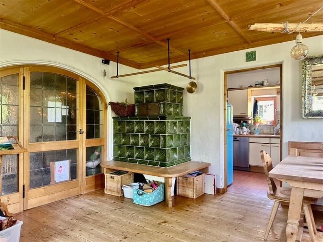 Der Wohnbereich, ausgestattet mit einem Kachelofen, Holzdielen und Holzdecken, schafft eine besonders gemütliche Atmosphäre. Von hier hat man Zugang zur angrenzenden Küche, der eine praktische Speis angegliedert ist. Vom Wohnbereich erschließt sich auch die schöne West-Terrasse. Richtung Süden ist ein Vorgarten angelegt, der sonnige Sitzmöglichkeiten bietet. Im Erdgeschoss ist außerdem ein Gäste-WC untergebracht.