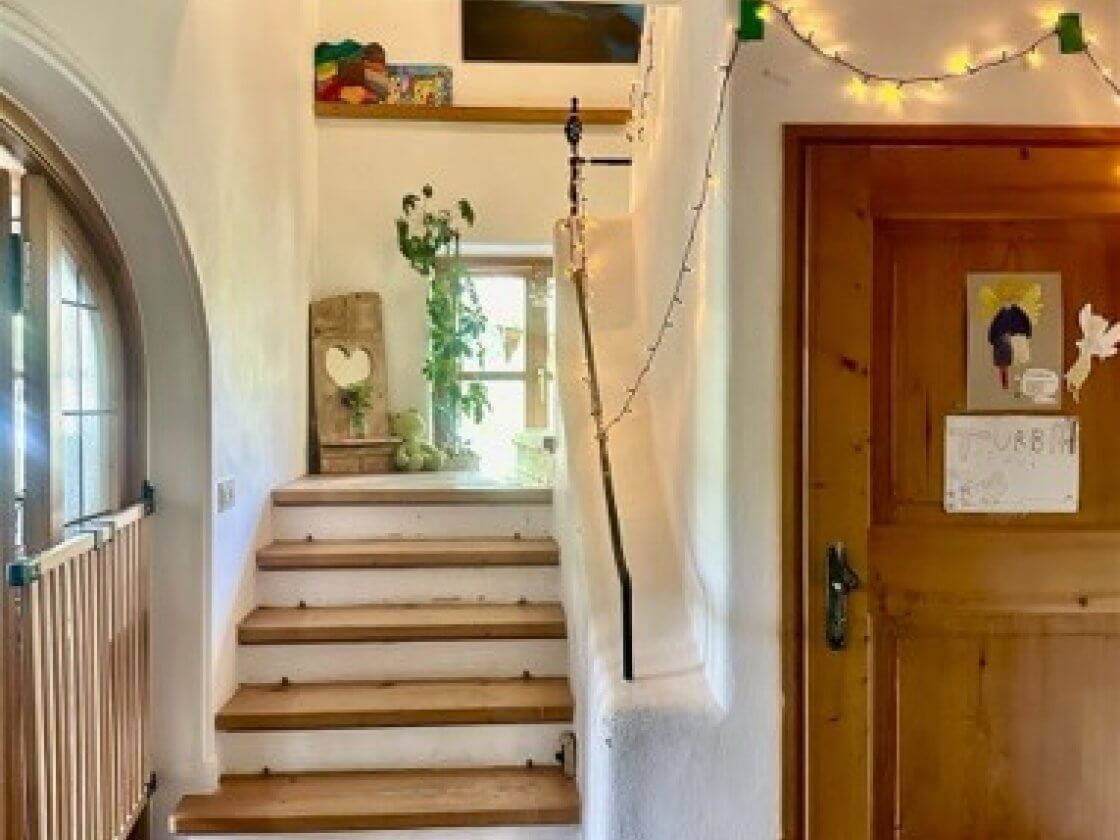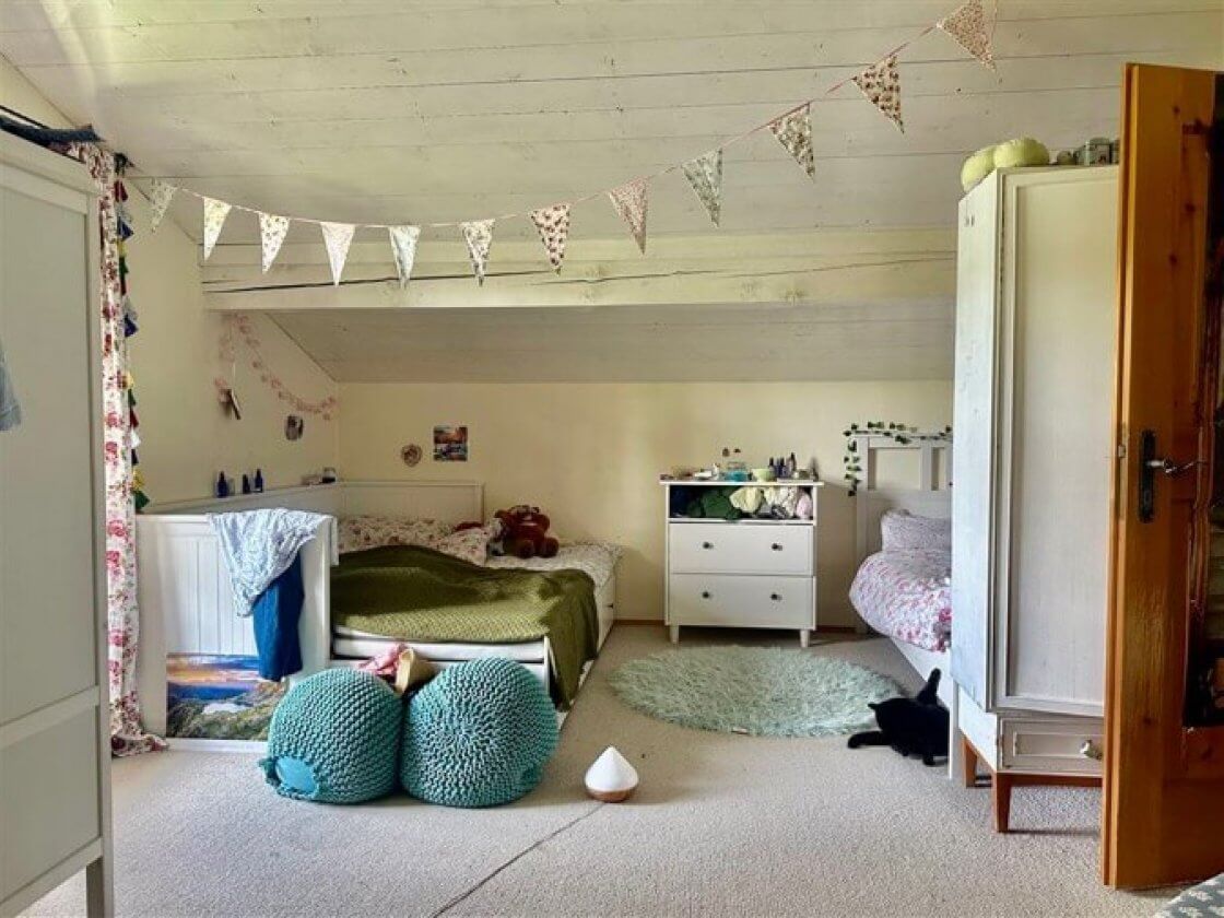 Wiederum ein halbes Geschoss höher befindet sich ein kleiner Galeriebereich im Dachgeschoss, der das großzügige Kinderzimmer erschließt. Auch dieses Zimmer verfügt über einen Kachelofen, der sich über die Galerie befeuern lässt, sowie einen Süd-Balkon.