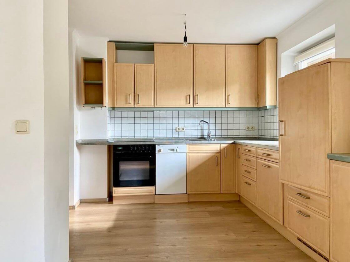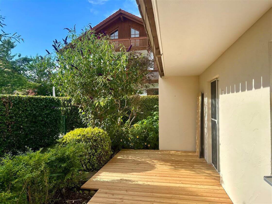 Diese schöne und gut geschnittene 2-Zimmerwohnung befindet sich in einem Mehrfamilienhaus mit sechs Einheiten im östlichen Teil Murnaus, am Ende einer ruhigen und ausschließlichen Anliegerstraße. Die großzügige Küche mit Einbauküche geht fließend in den Wohnbereich über. Von hier hat man Zugang zu der sonnigen, knapp 15 m² großen Süd-West-Terrasse mit kleinem Garten und eigenem Gartentor. Die ansprechende Holzterrasse ist erst kürzlich erneuert worden. Das geräumige Schlafzimmer ist Richtung Osten ausgerichtet und bietet neben einem Doppelbett auch Platz für einen großen Schrank.Das Tageslichtbad verfügt u.a. über eine Badewanne. Des Weiteren steht ein eigenes Kellerabteil, sowie ein Waschmaschinen- und Fahrradraum im Untergeschoss zur Verfügung. Das Auto kann auf einem eigenen Außenstellplatz geparkt werden.