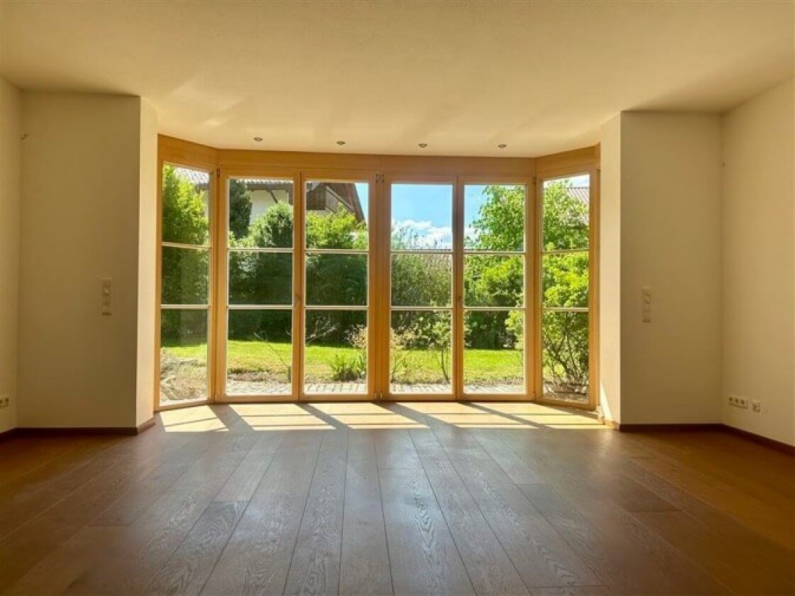 Das Wohnzimmer ist Richtung Süden ausgerichtet und mit einem schönen Eichendielenboden und einem Holzofen mit Sichtfenster und Ofenbank ausgestattet. Ein Fenstererker mit bodentiefen Terrassentüren lässt hier viel Licht hinein und bietet Zugang zu der gepflasterten runden Rosenterrasse und in den Garten.