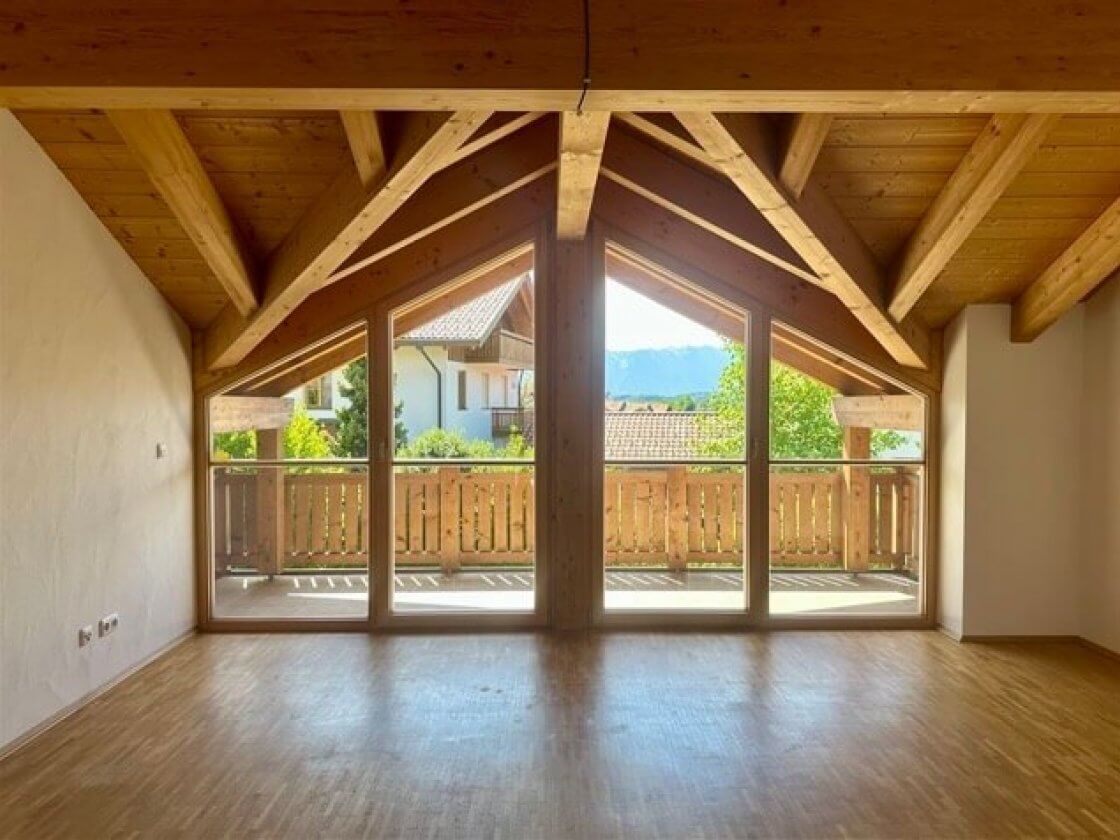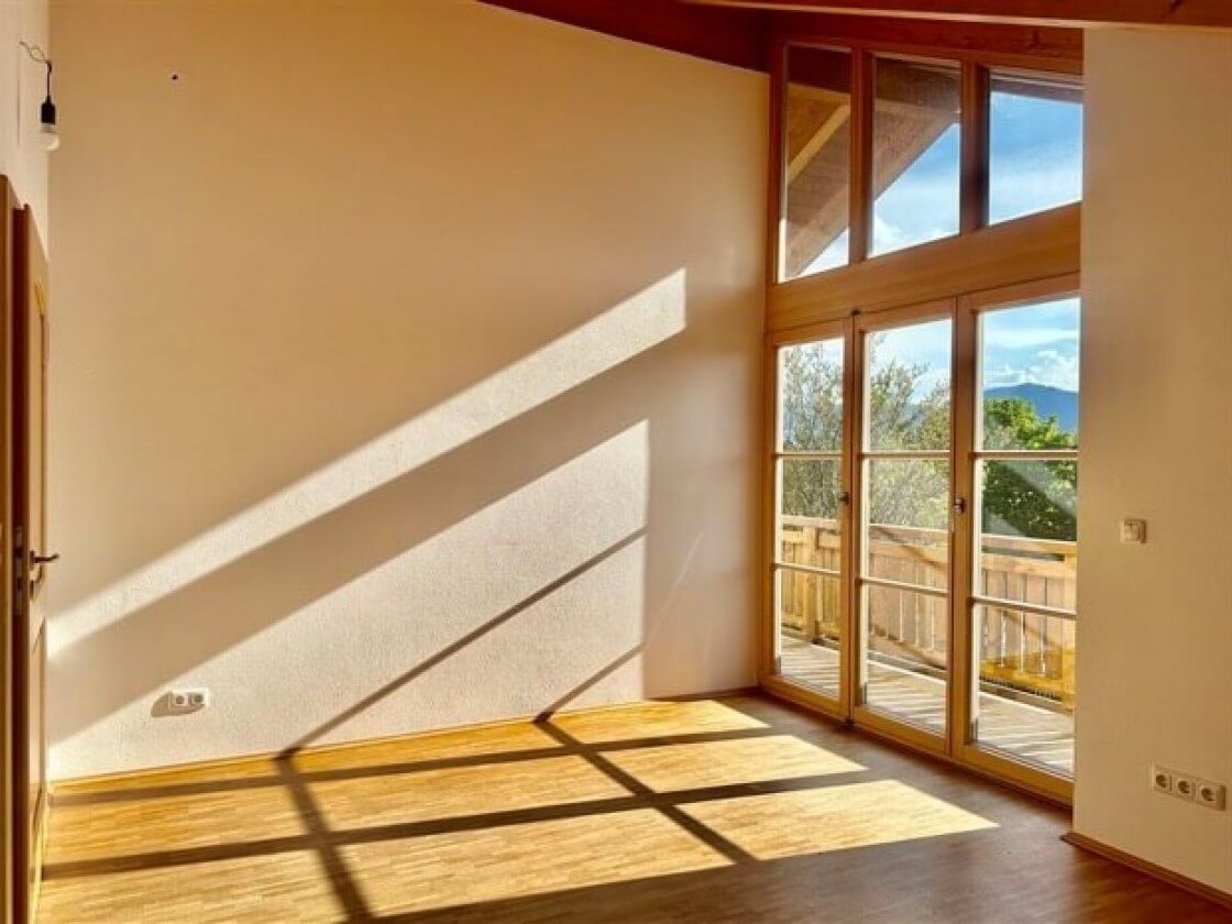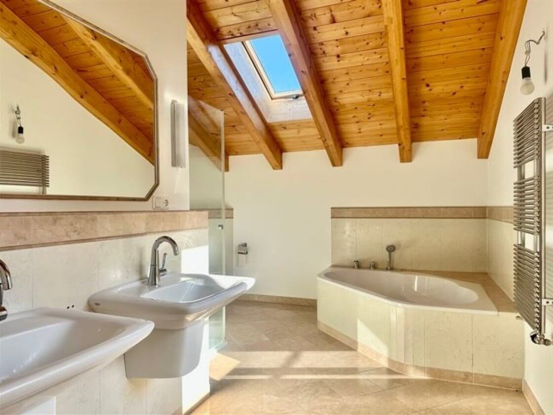 Das Obergeschoss beherbergt vier (Schlaf-) Zimmer und schafft mit der enormen Raumhöhe bis zum Sichtdachstuhl eine besondere Atmosphäre. Das Elternschlafzimmer hat Zugang zum großzügigen 12 m² Ensuite-Bad. Dieses ist mit einer Badewanne, einer Dusche, einem WC und einem Doppelwaschtisch ausgestattet. Ein Dachflächenfenster und ein Ostfenster lassen hier die Morgensonne hinein. Die zwei gleich große (Kinder-) Zimmer sind mit Balkonzugang. Die enorme Raumhöhe bis zum Giebel bietet sich für Hochbetten an. Der vollständig verglaste Giebel ermöglicht einen schönen Bergblick zur Hohen Kiste und Richtung Westen zum Hörnle.