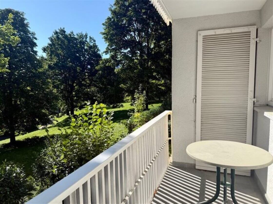 Vom Wohnzimmer aus erschließt sich der nach Osten ausgerichtete Balkon, der einen herrlichen Blick ins Grüne ermöglicht. Hier ist ein kleiner Außen-Abstellraum begehbar. Eine zusätzliche Kammer innerhalb der Wohnung schafft praktischen Stauraum. Ein Kellerraum und ein Außenstellplatz gehören ebenfalls zur Einheit.