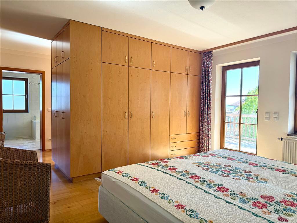Der großzügige Elternbereich mit einer Fläche von über 40 m² besteht aus einem Schlafzimmer, einer Ankleide und einem ensuite-Badezimmer. Der vorgelagerte Balkon ermöglicht einen ungestörten Blick ins Grüne und auf das Hörnle. Das Masterbad ist hochwertig ausgestattet mit bodentiefer Dusche, Badewanne, Doppelwaschbecken, WC und Bidet.