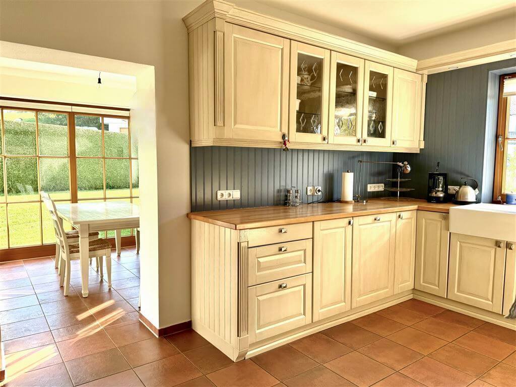 Die Küche ist mit einer hochwertigen Einbauküche samt Mielegeräten ausgestattet und ein heller, freundlichen Essplatz mit Zugang zur Terrasse und dem überdachten Freisitz schließt hier an.