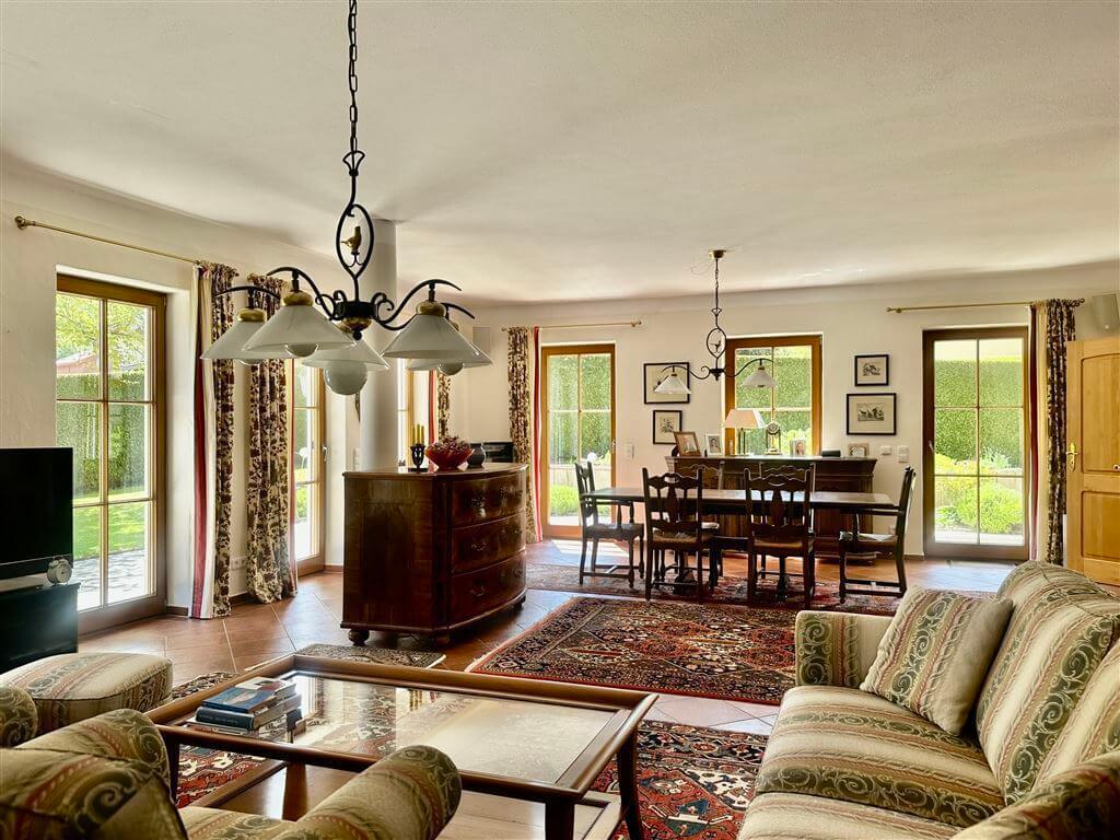 Das Wohn- und Esszimmer verfügt über eine Fläche von rund 56 m² und bietet durch bodentiefe Terrassentüren viel Tageslicht sowie direkten Zugang zur umlaufenden Terrasse und in den nach Süden ausgerichteten Garten mit Gartenhaus.