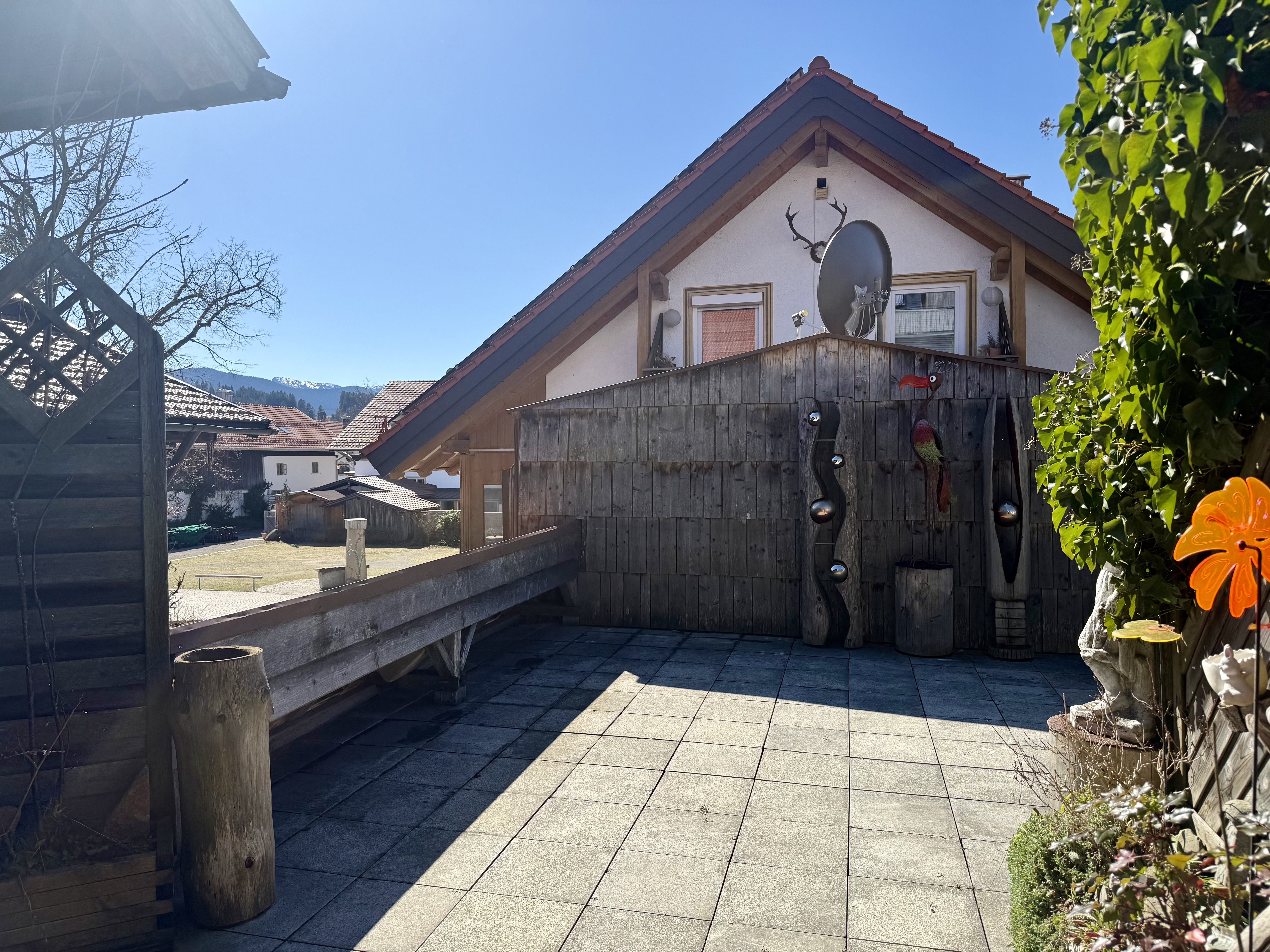 Die Tenne bietet Zugang zu einer über 40 Quadratmeter großen Dachterrasse mit Südwest-Ausrichtung. Ein großzügig überdachter Bereich ermöglicht es hier, wettergeschützt in großer Runde zusammenzusitzen.