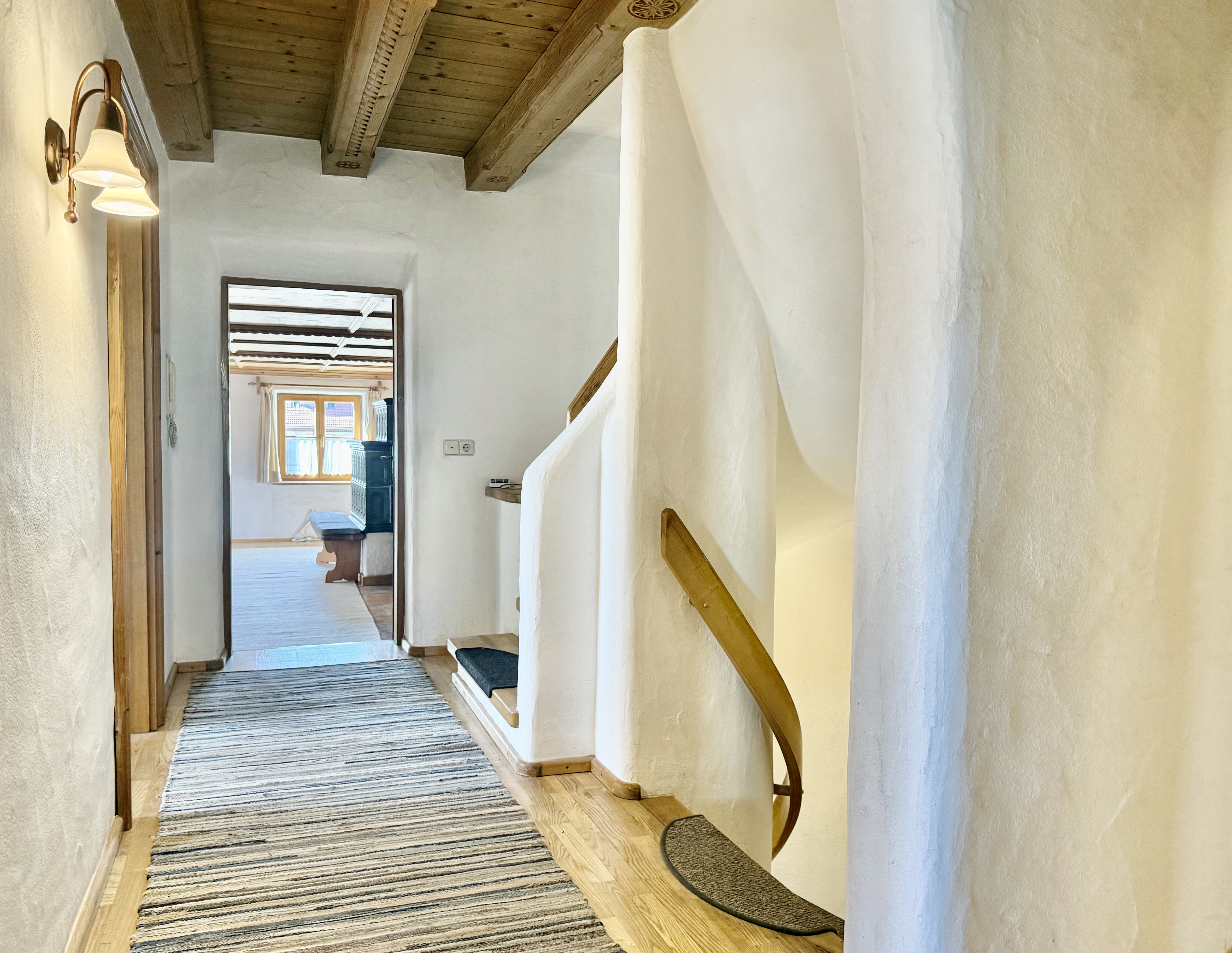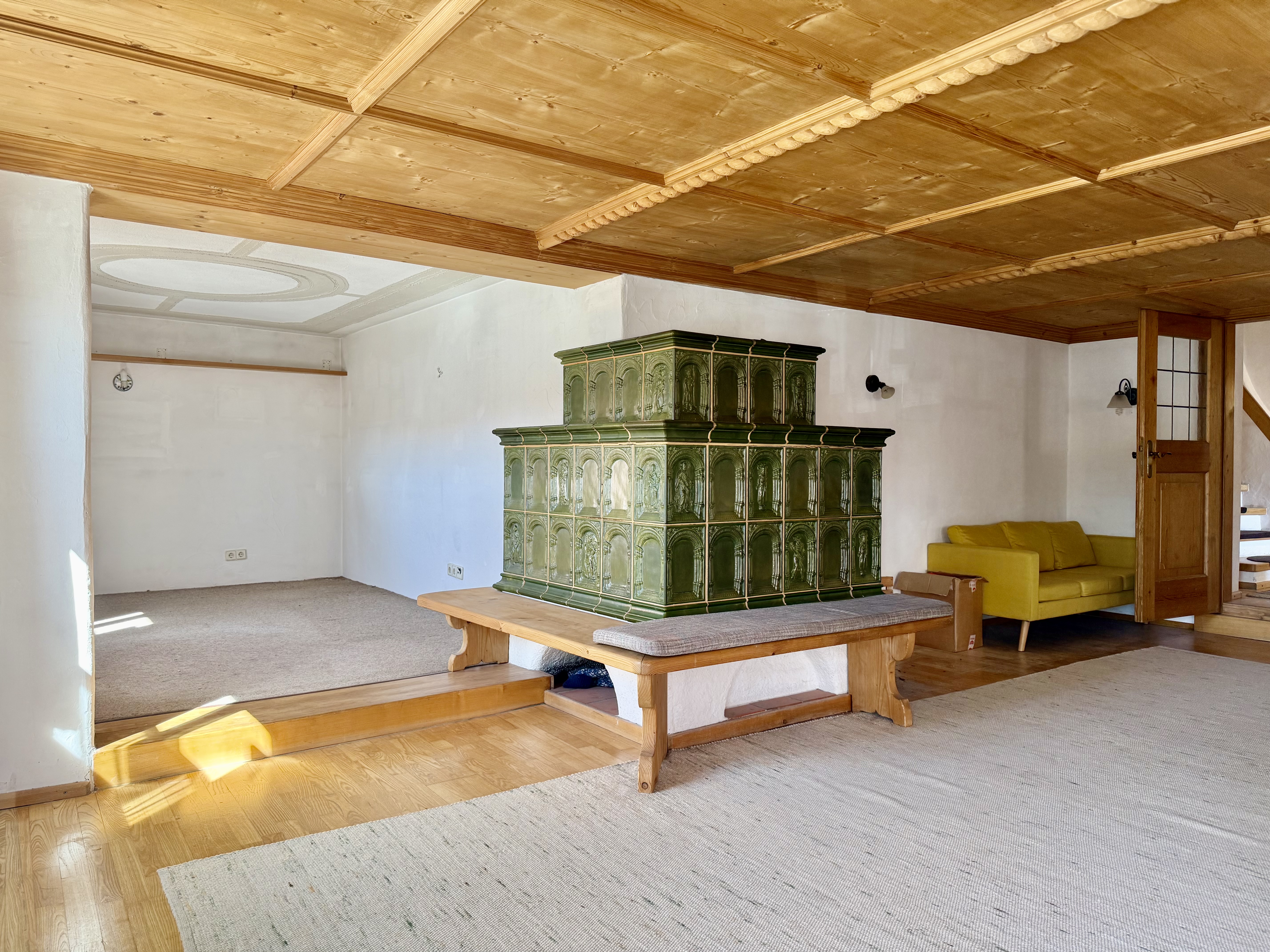Im Obergeschoss befindet sich eine gemütliche Stube mit holzvertäfelter Decke und traditionellem Kachelofen, der den historischen Charakter des Hauses unterstreicht. Ein geschützter Balkon ist vorgelagert. Auf dieser Etage ist außerdem eine Küche, drei Schlafzimmer, ein Badezimmer, ein separates WC sowie eine Speis untergebracht. Von hier aus ist auch die charmante Tenne zugänglich, die eine Sauna beherbergt, die bei bedarf übernommen werden kann.