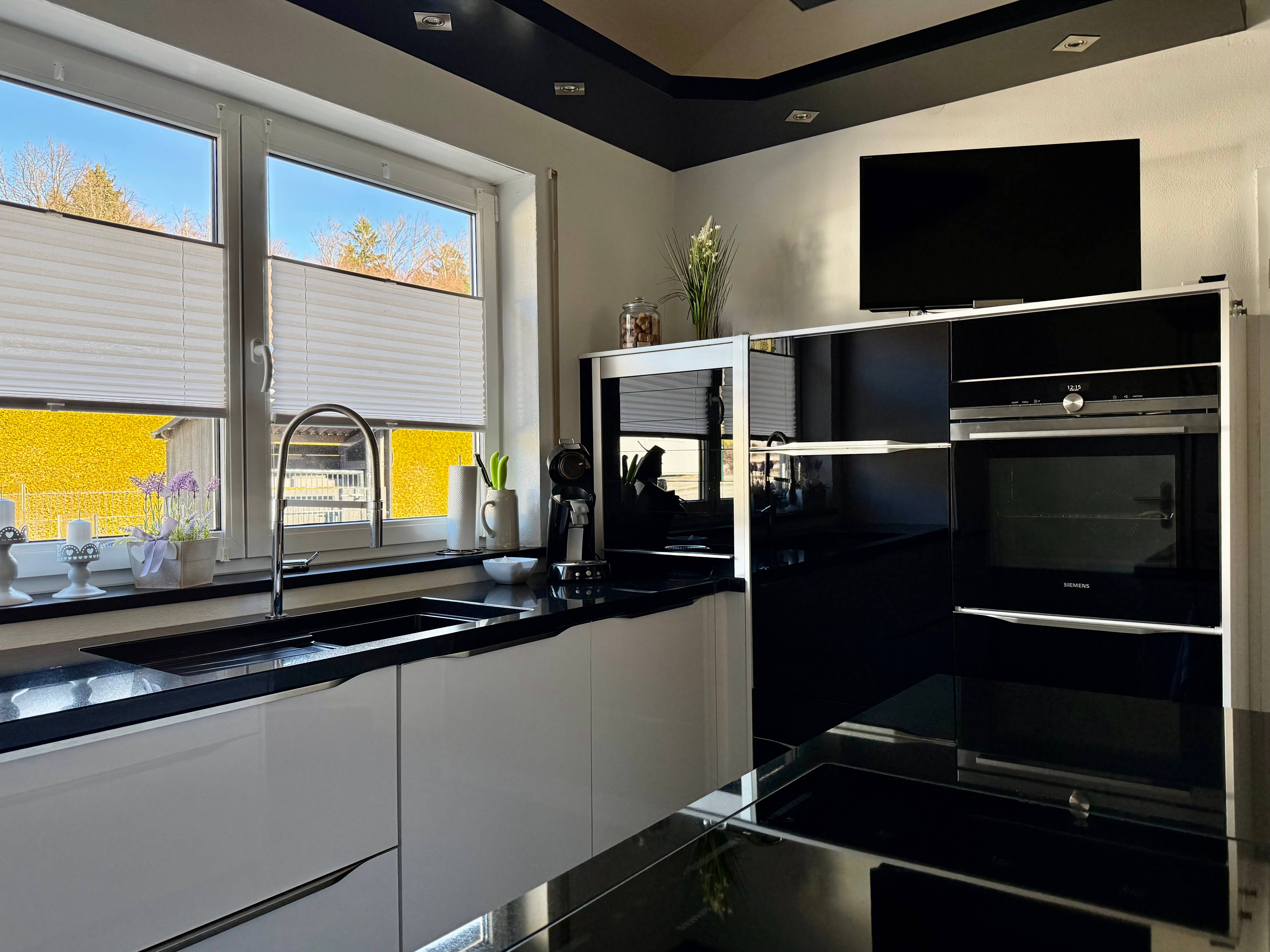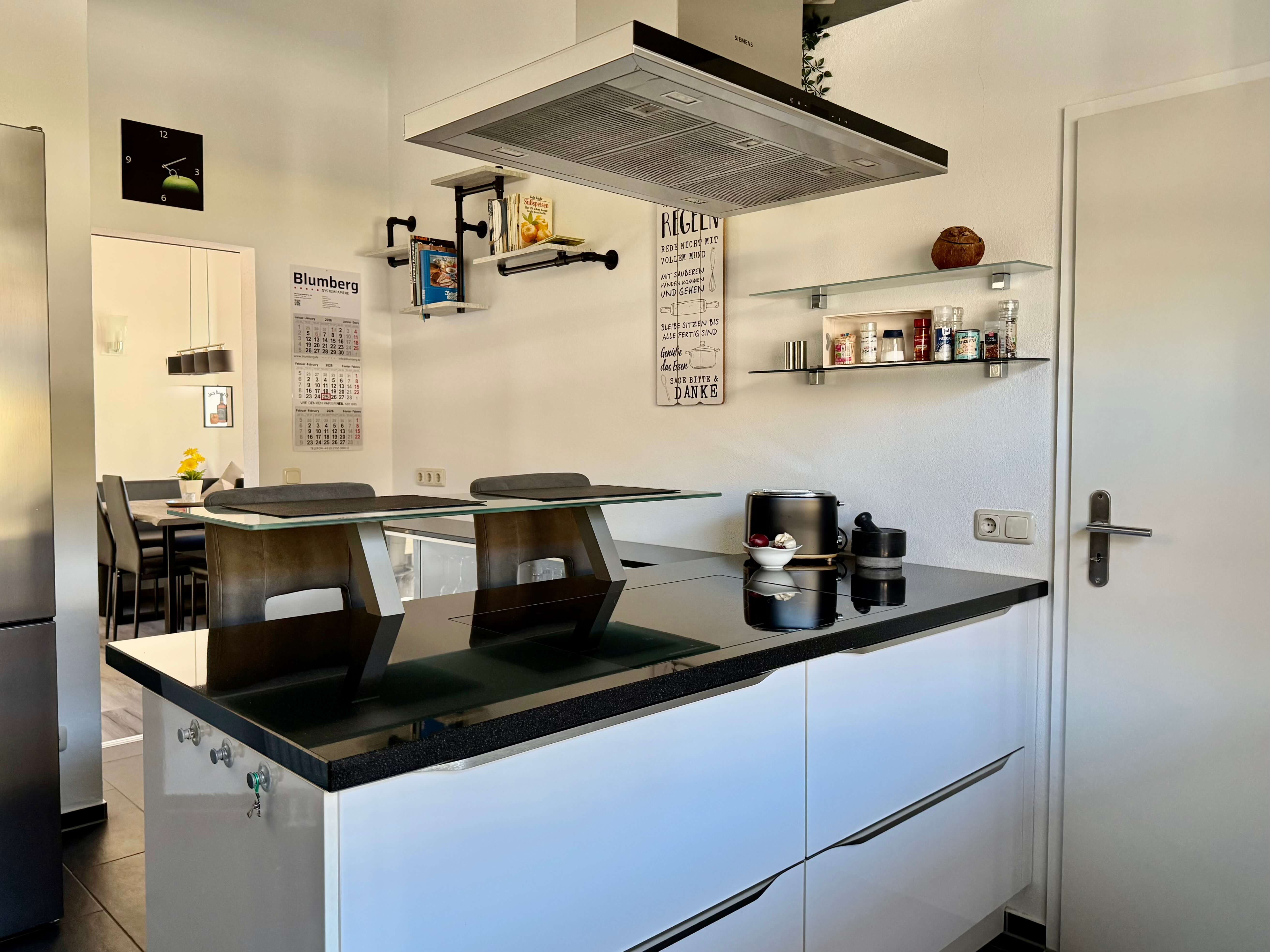 Die Küche ist sowohl vom Wohnbereich als auch direkt vom Esszimmer aus erreichbar und ist mit einer modernen Einbauküche einschließlich Kochinsel ausgestattet.