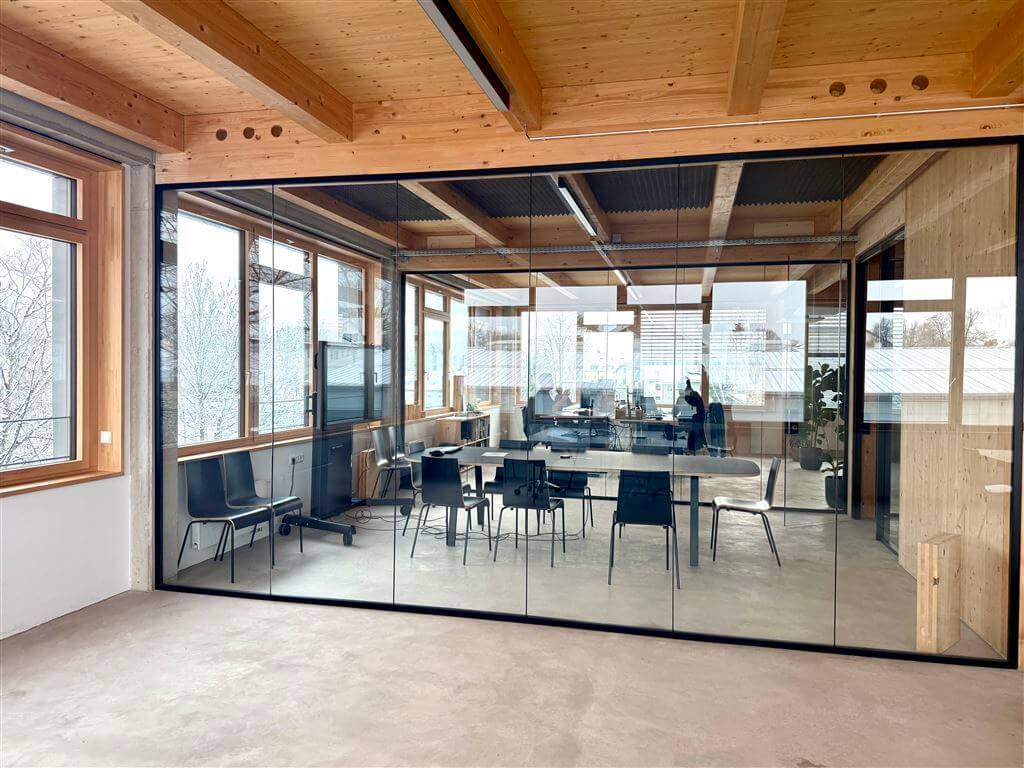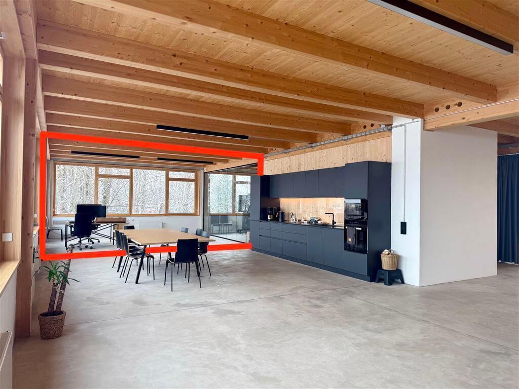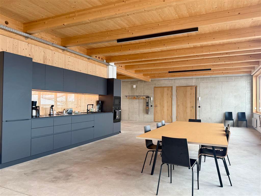 Die großzügigen Fensterflächen in Kombination mit viel Holz und Sichtestrich als Bodenbelag sorgen hier für eine helle Arbeitsatmosphäre und unterstreichen den modernen Charakter des Gebäudes.