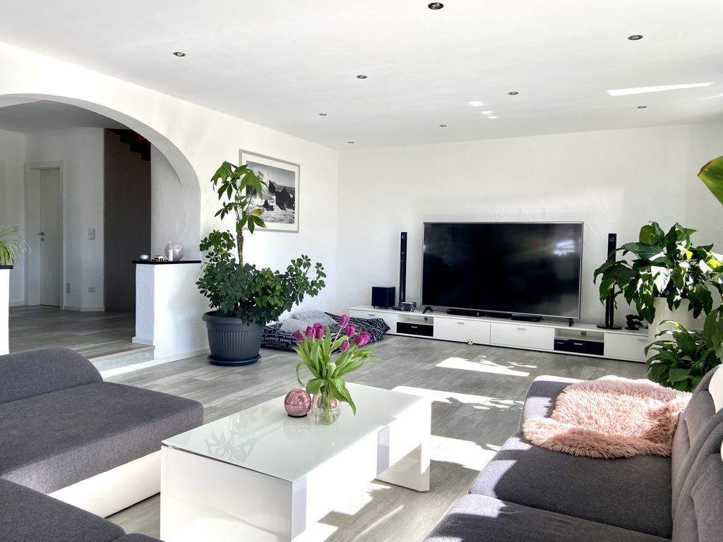 Über den Eingangsbereich auf der Nordseite, wo die Garderobe und das Gäste-WC mit Dusche untergebracht ist, erreicht man den weitläufigen Wohnbereich mit Essplatz und offener Küche. Ein großer Rundbogen ermöglicht hier die Blickachse zum lichtdurchfluteten Wohnzimmer. Die Südausrichtung und die bodentiefen Fenster lassen viel Sonne hinein.