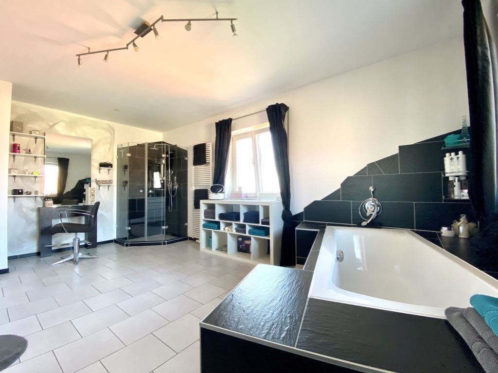 Das großzügige fast 18 m2 große Badezimmer ist mit einer Badewanne, Dusche und einem Doppelwaschtisch ausgestattet. Das WC ist separat.