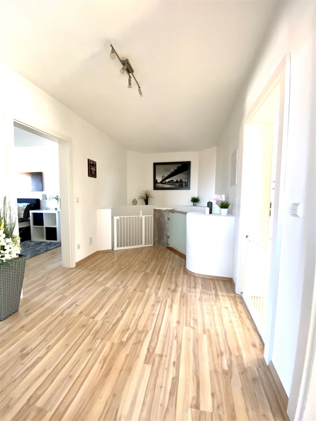 Die schöne Treppe führt hinauf ins erste Obergeschoss, wo ein größeres (Eltern-) Schlafzimmer und zwei weitere Schlafzimmer untergebracht sind.