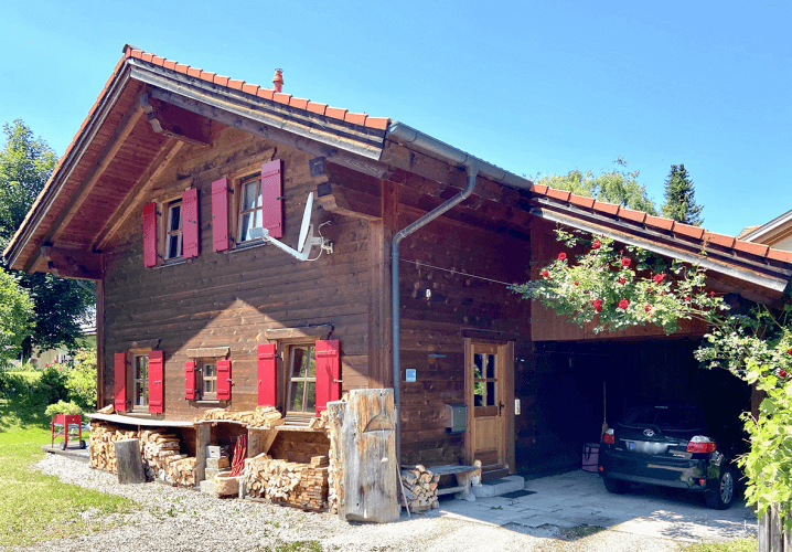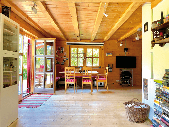 Der Wohnbereich im Erdgeschoss mit offener Küche und Essplatz ist großzügig gestaltet. Die massiven Holzwände und der Dielenboden vermitteln eine gemütliche und warme Atmosphäre mit einem tollen Raumklima. Von hier hat man auch Zugang zu der großen vorgelagerten Holzterrasse mit Glasüberdachung und elektrischer Markise.