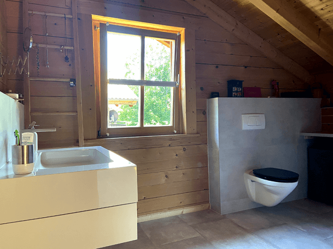 Das Herz des Hauses bildet der gemauerte Grundofen, der zentral um die Räume angeordnet ist. Befeuert wird er von der gro.zügigen Diele aus. Über eine schöne Holztreppe erreicht man das luftig hohe Dachgeschoss. Zwei Dachflächenfenster lassen viel Licht hinein in den offenen Arbeits- und Wohnbereich. Sowohl von hier als auch vom Schlafzimmer aus hat man Zugang zum Westbalkon. Das Badezimmer wurde erst 2019 geschmackvoll neu gestaltet. Von hier erreicht man das angrenzende Ankleidezimmer, in dem auch die Gas-Heizung untergebracht ist. Das Haus ist nicht unterkellert. Abstell- und Staumöglichkeiten hat man im Lager- und Geräteraum (auch als Werkstatt nutzbar) hinter dem Carport, der direkt an das Haus angrenzt. Zwei Außenstellplätze stehen zusätzlich auf dem Grundstück zur Verfügung.