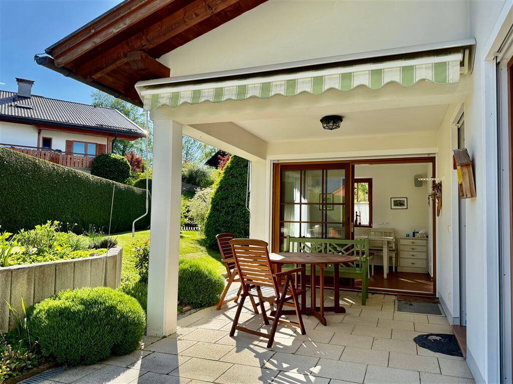 Die Küche ist mit einer hochwertigen Einbauküche samt Mielegeräten ausgestattet und ein heller, freundlichen Essplatz mit Zugang zur Terrasse und dem überdachten Freisitz schließt hier an.