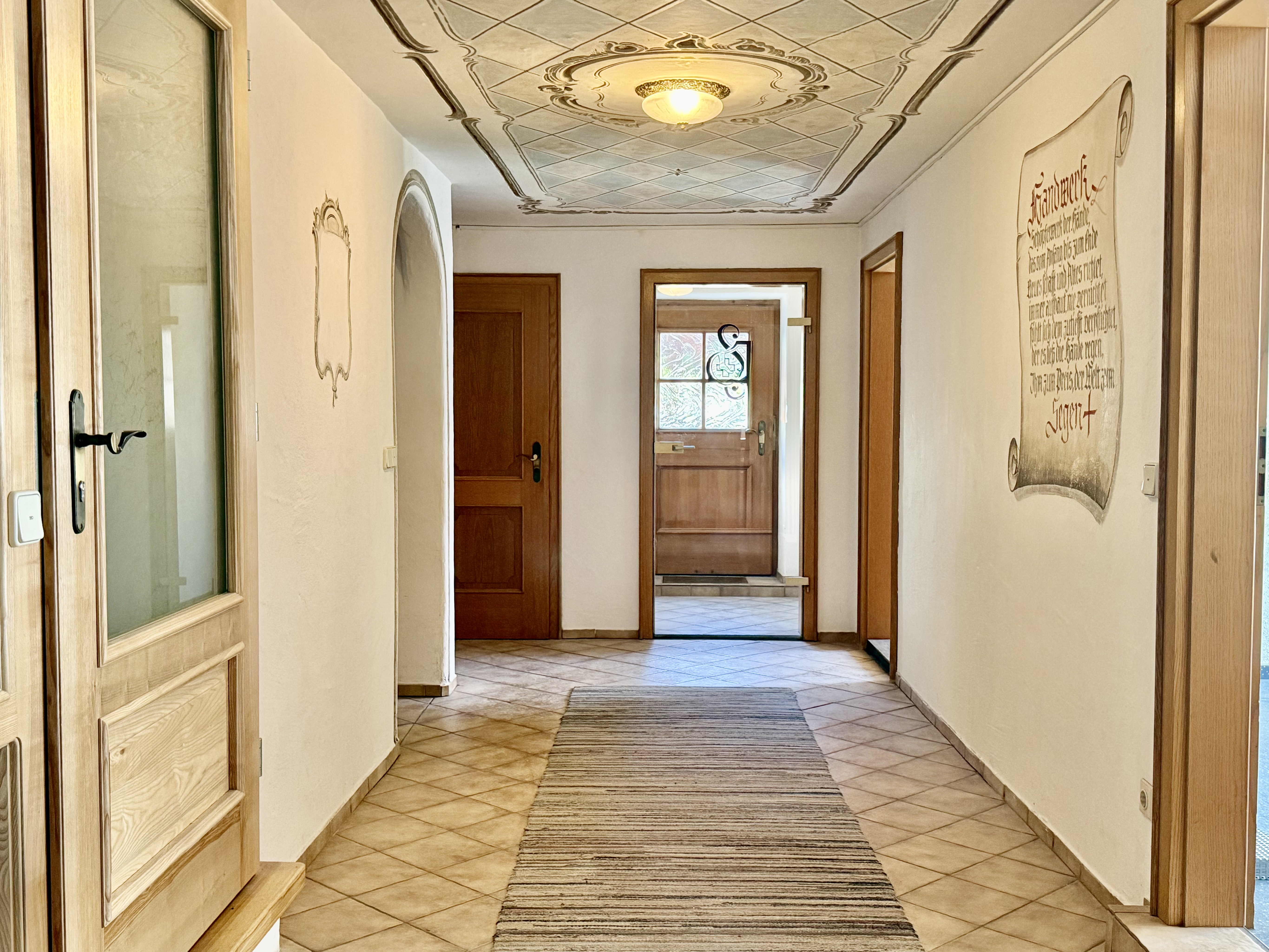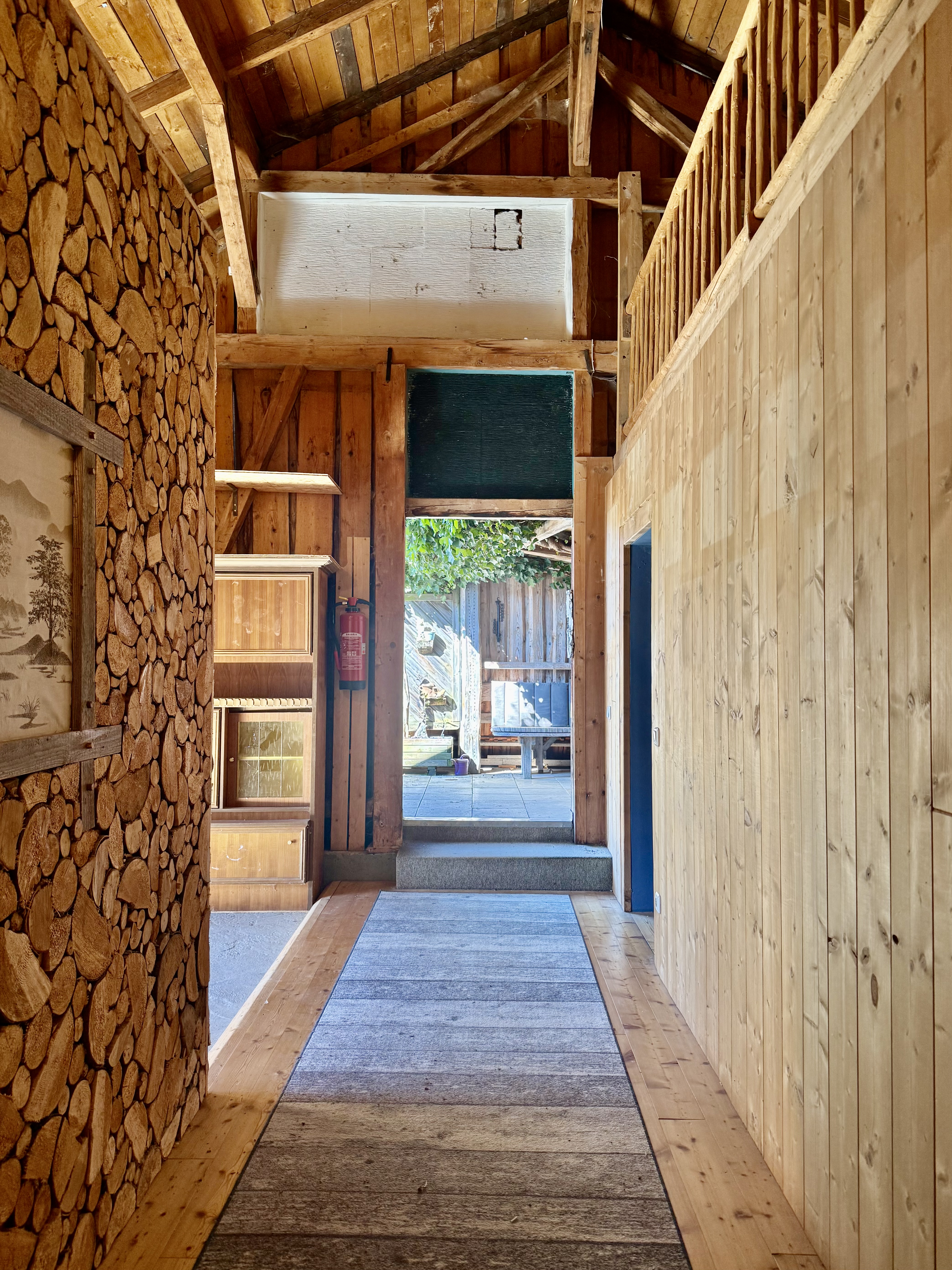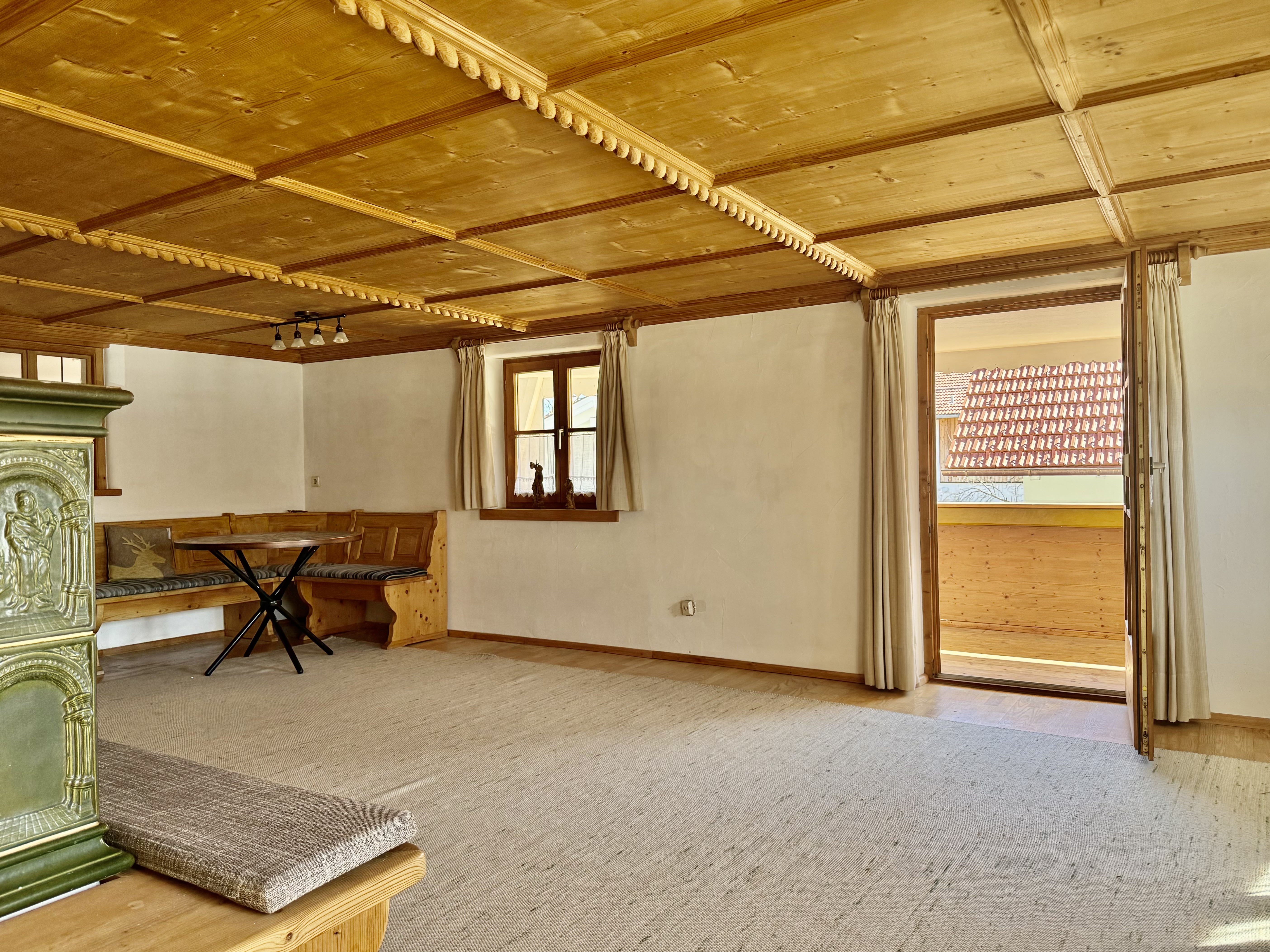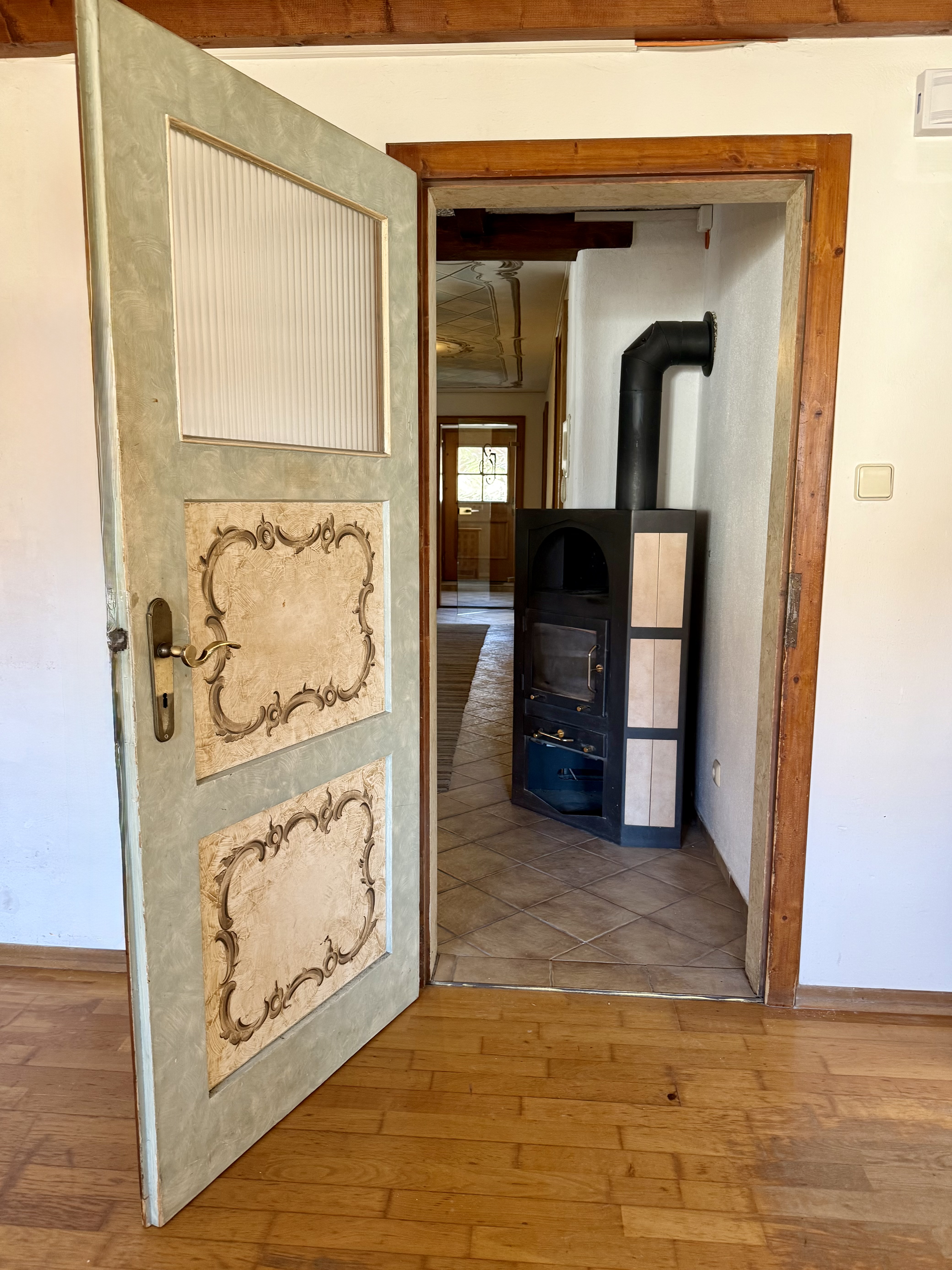 Im Obergeschoss befindet sich eine gemütliche Stube mit holzvertäfelter Decke und traditionellem Kachelofen, der den historischen Charakter des Hauses unterstreicht. Ein geschützter Balkon ist vorgelagert. Auf dieser Etage ist außerdem eine Küche, drei Schlafzimmer, ein Badezimmer, ein separates WC sowie eine Speis untergebracht. Von hier aus ist auch die charmante Tenne zugänglich, die eine Sauna beherbergt, die bei bedarf übernommen werden kann.