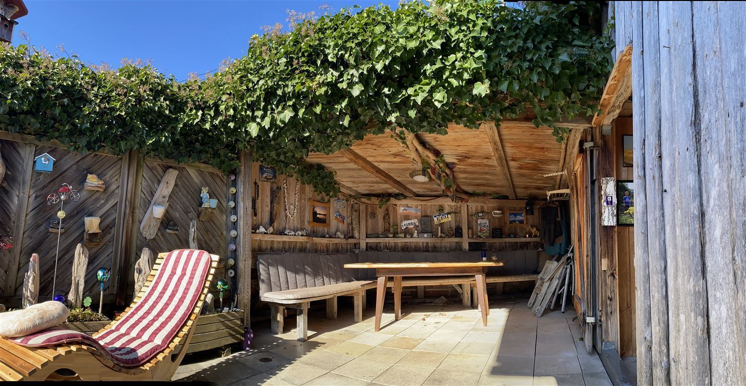 Die Tenne bietet Zugang zu einer über 40 Quadratmeter großen Dachterrasse mit Südwest-Ausrichtung. Ein großzügig überdachter Bereich ermöglicht es hier, wettergeschützt in großer Runde zusammenzusitzen.