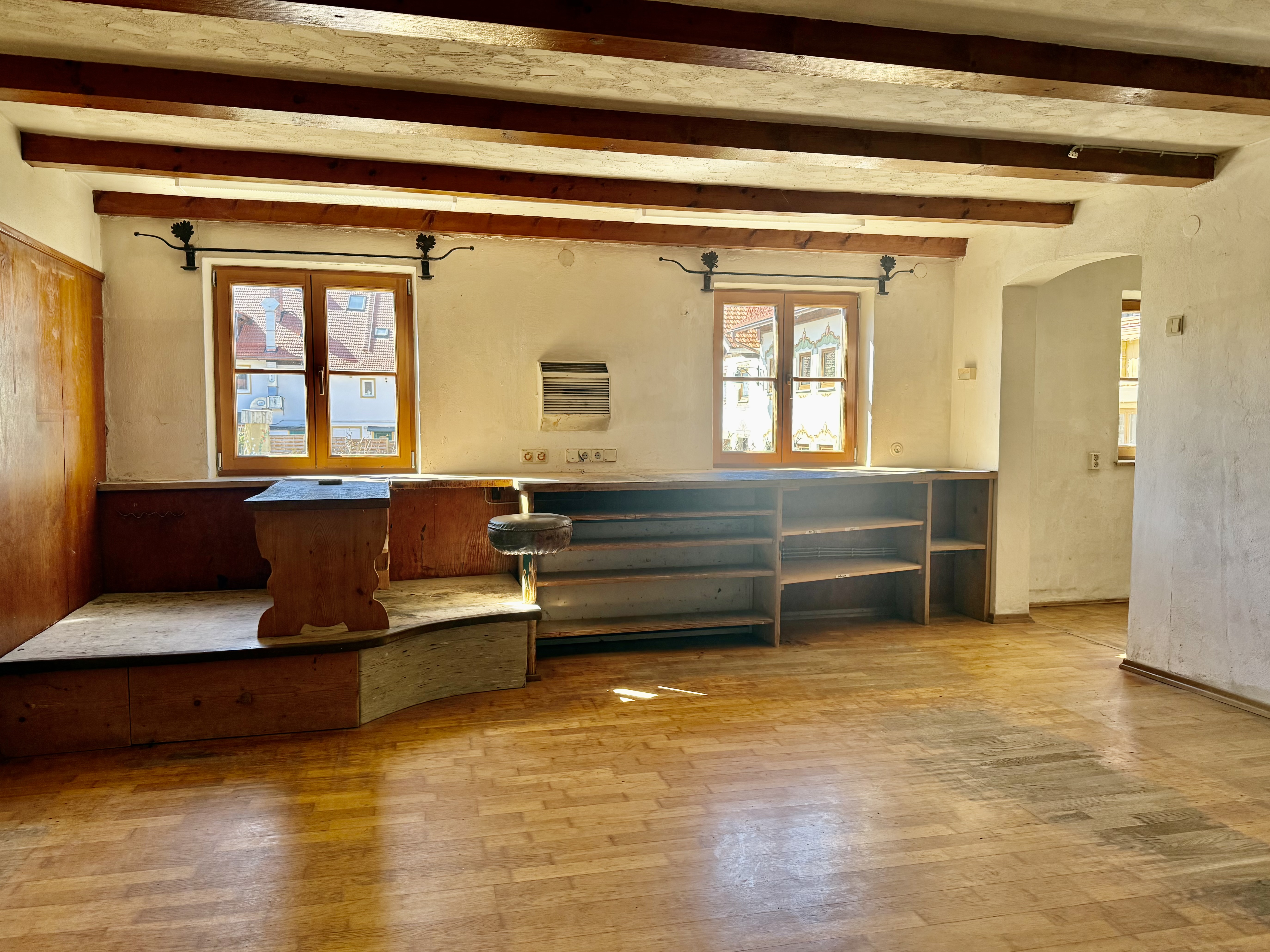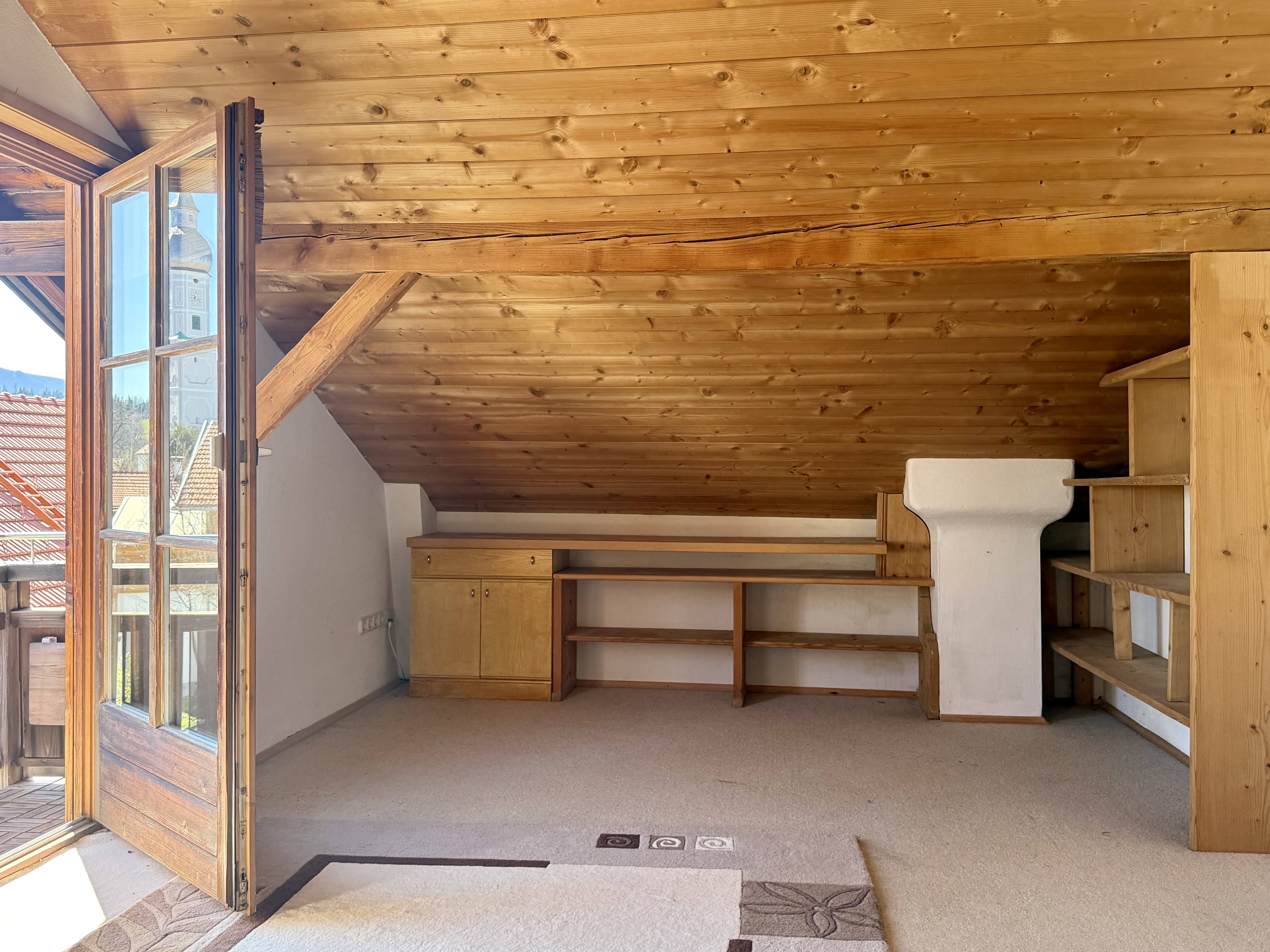 Im ausgebauten Dachgeschoss aus den 1990er Jahren sind zwei weitere Wohnräume untergebracht, die flexibel als Schlafzimmer oder Arbeitszimmer genutzt werden können. Ein Balkon Richtung Süd-Osten bietet einen herrlichen Blick über den Kirchturm bis zum Hörnle.