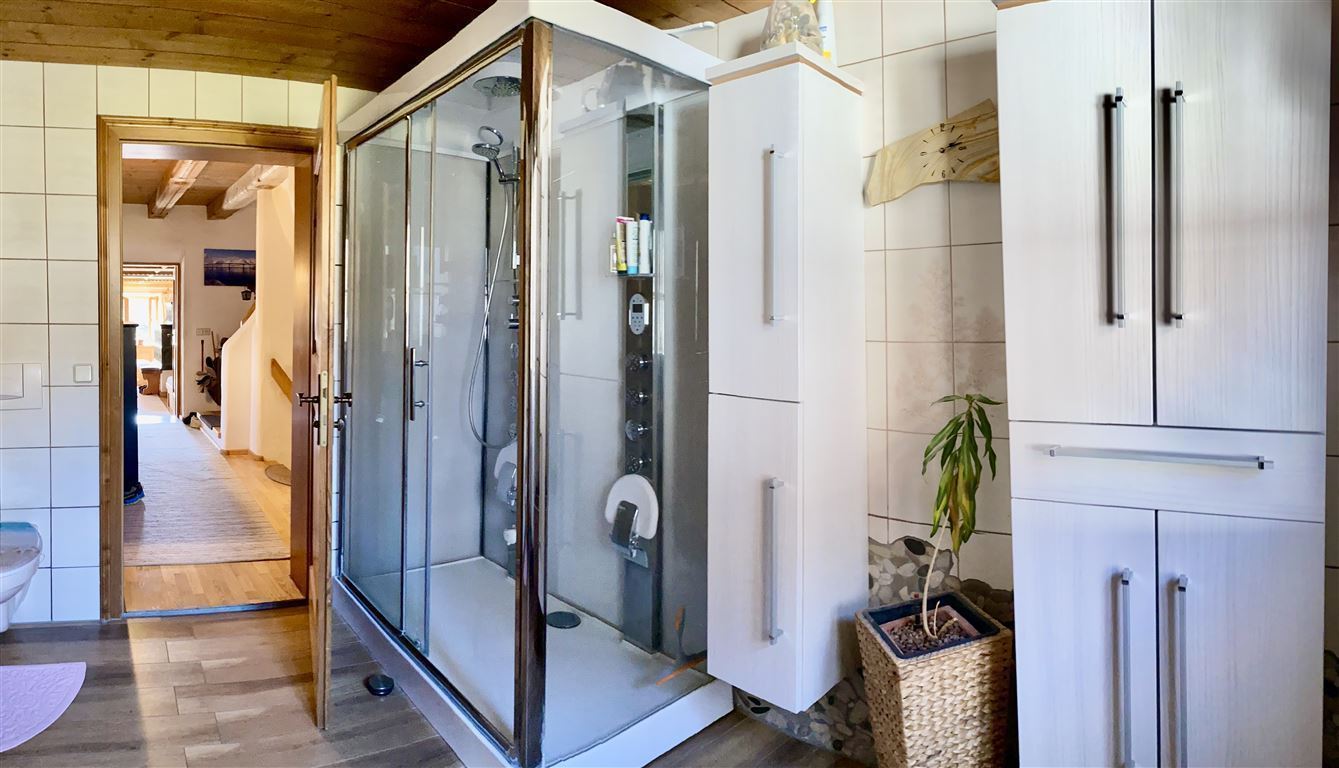 Des Weiteren befindet sich auf dieser Ebene ein Badezimmer mit Dusche und WC. Für zusätzlichen Stauraum stehen ein größerer Speicherraum, sowie der obere Teil der Tenne zur Verfügung.