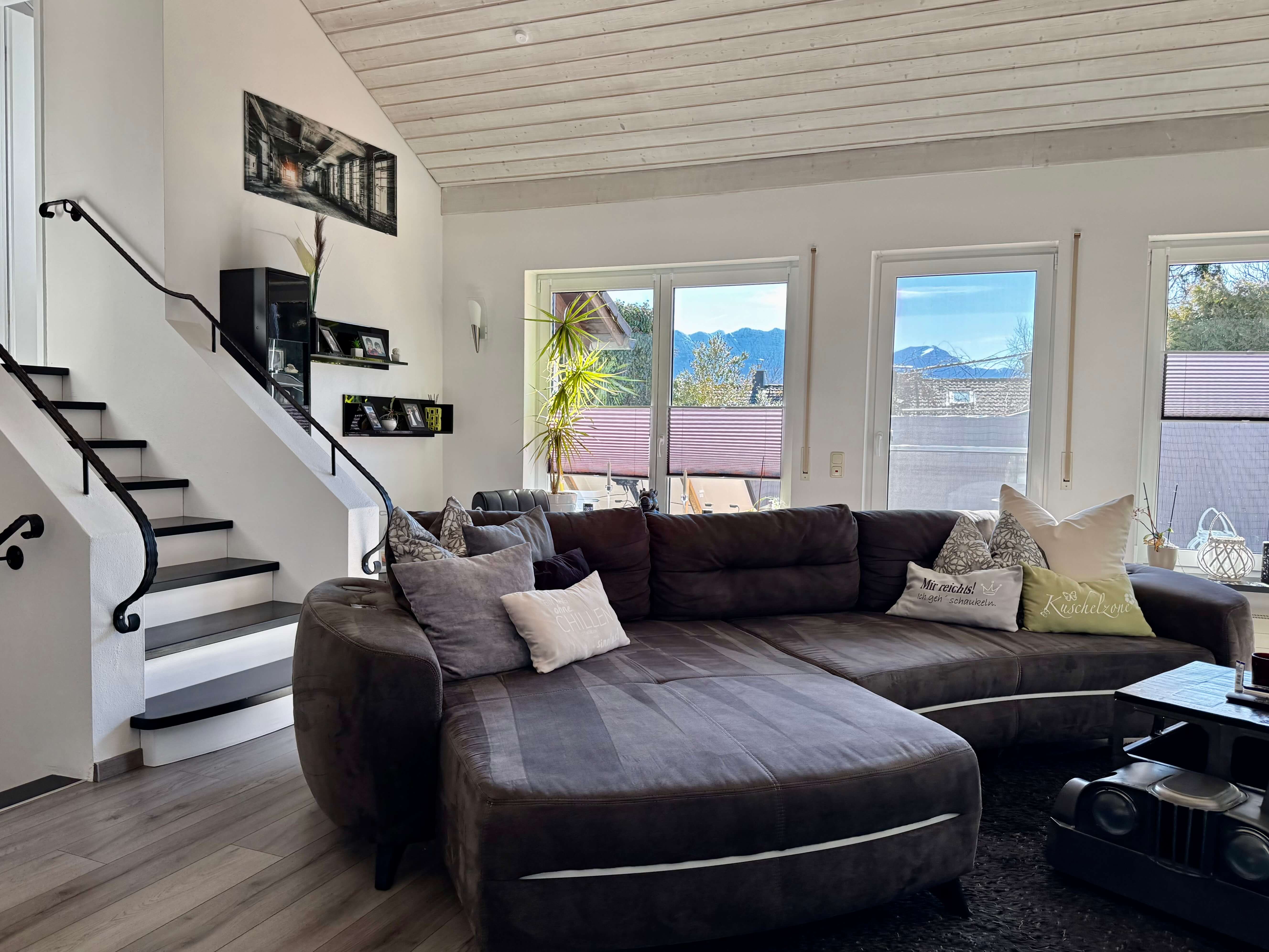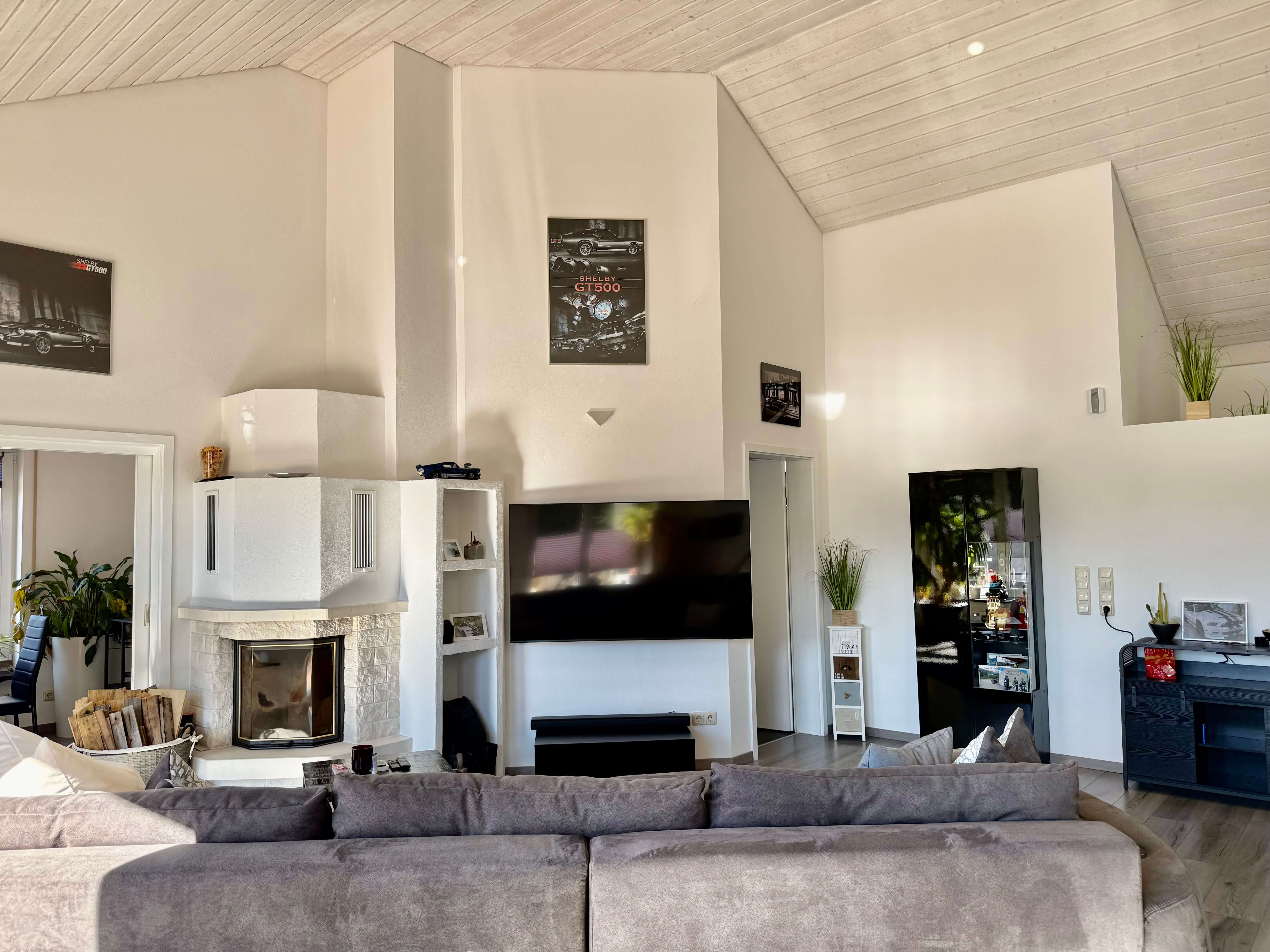 Das Zentrum des Hauses bildet der offene und großzügige Wohnraum mit Kaminofen und fließendem Übergang zum Esszimmer. Der loftartige Charakter wird durch die giebelhohe Raumhöhe und die großen Fensterflächen zur Südseite mit Bergblick unterstrichen. Von hier aus besteht direkter Zugang zur vorgelagerten Südterrasse sowie in den Garten.