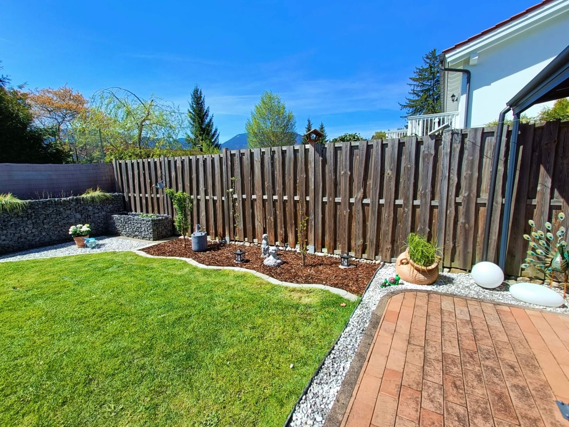 Der Außenbereich ist liebevoll mit einem Grillpavillon, einem Gartenhaus mit überdachtem Sitzplatz sowie einem kleinen Gewächshaus gestaltet.