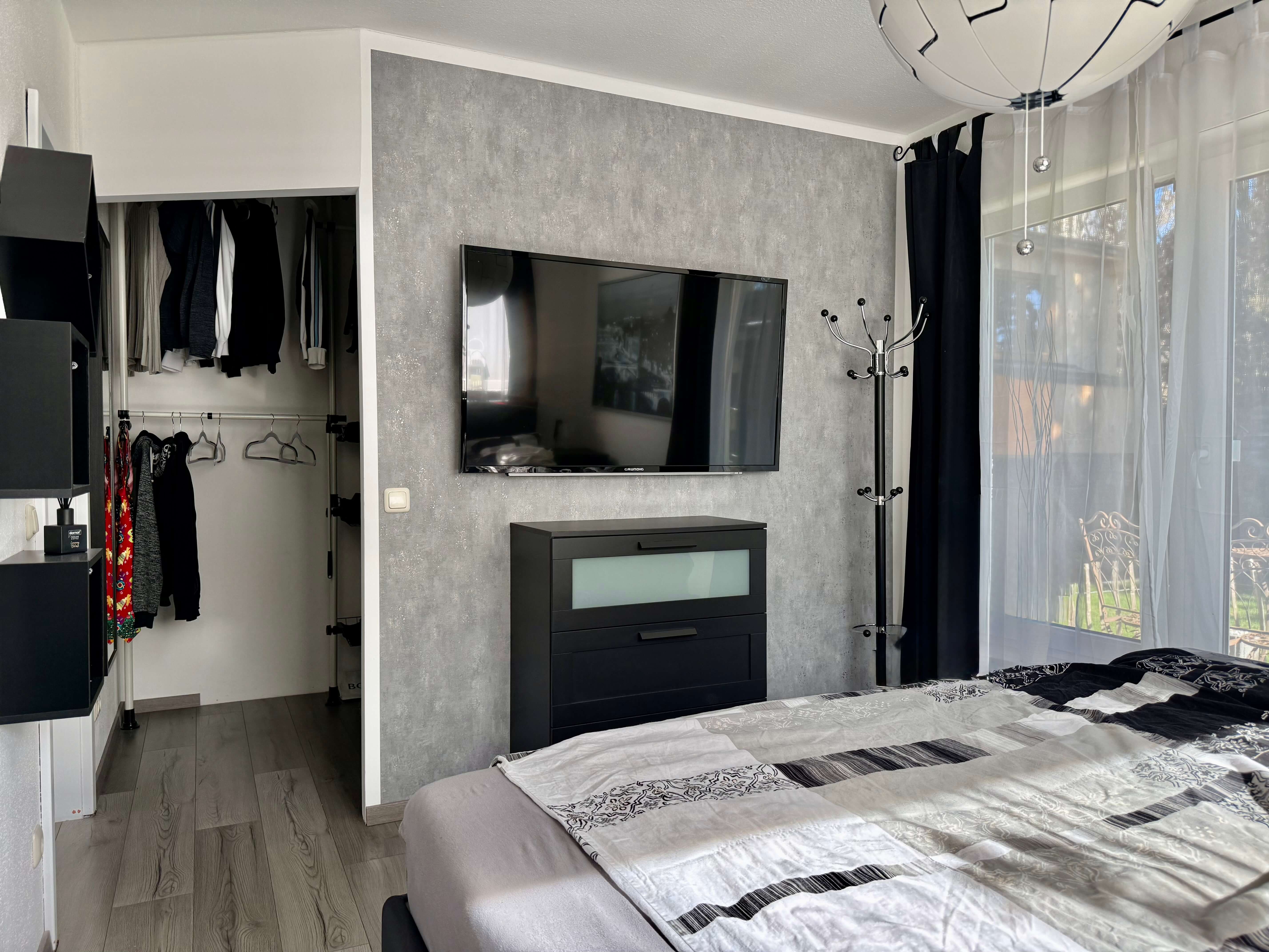 Auf der unteren, zur Gartenseite gelegenen Ebene ist ein weiteres Schlafzimmer mit Bad en suite untergebracht. Dieses Badezimmer befindet sich derzeit noch im Rohbauzustand und kann von den neuen Eigentümern nach eigenen Vorstellungen fertiggestellt werden. Das Schlafzimmer verfügt zudem über einen Ankleidebereich sowie einen direkten Zugang zur Ostterrasse und in den Garten.