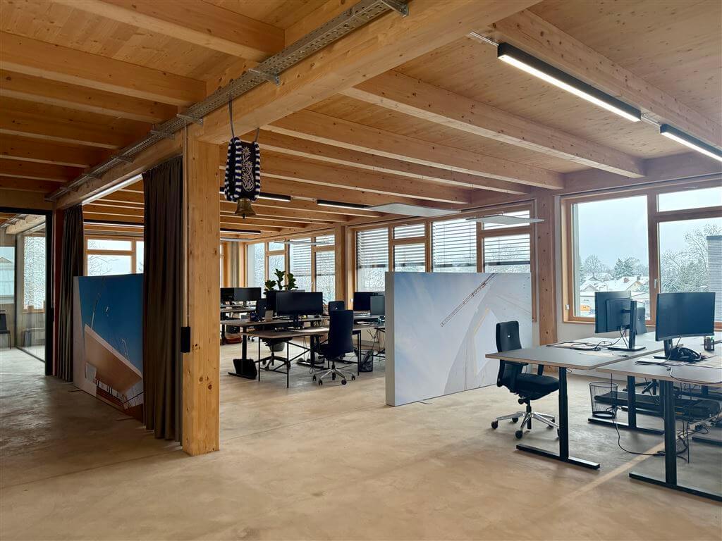 Die großzügigen Fensterflächen in Kombination mit viel Holz und Sichtestrich als Bodenbelag sorgen hier für eine helle Arbeitsatmosphäre und unterstreichen den modernen Charakter des Gebäudes.