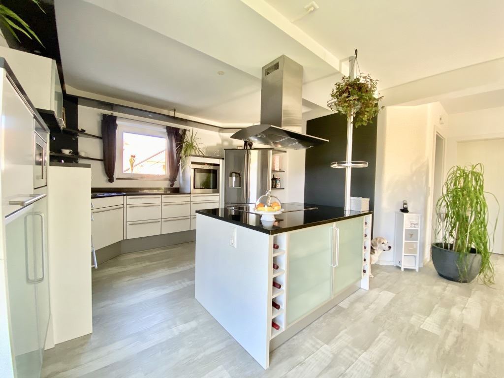 Über den Eingangsbereich auf der Nordseite, wo die Garderobe und das Gäste-WC mit Dusche untergebracht ist, erreicht man den weitläufigen Wohnbereich mit Essplatz und offener Küche. Ein großer Rundbogen ermöglicht hier die Blickachse zum lichtdurchfluteten Wohnzimmer. Die Südausrichtung und die bodentiefen Fenster lassen viel Sonne hinein.