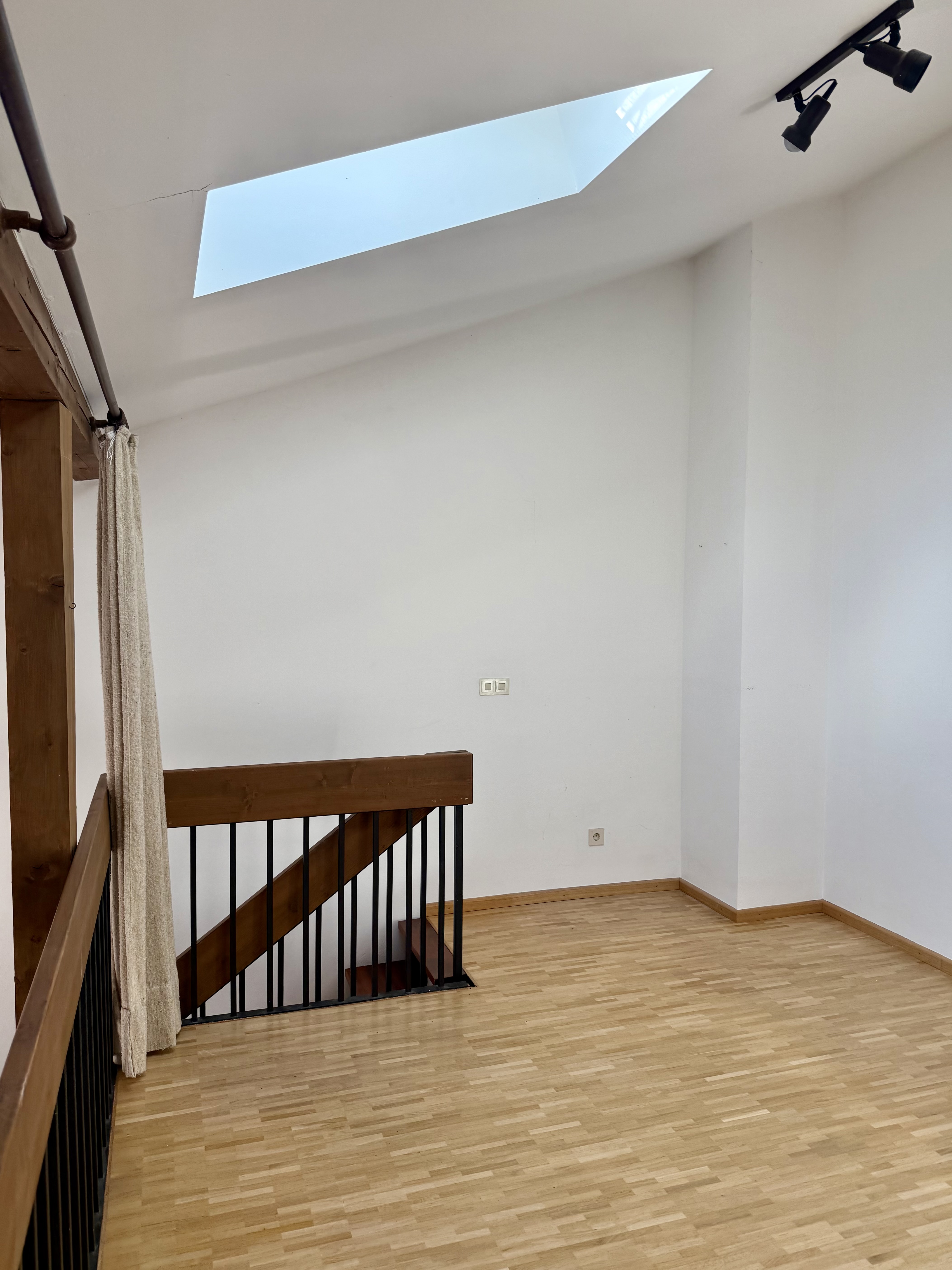 Der großzügige Wohnraum ist mit einem Parkettboden ausgestattet und verfügt über eine Treppe, die hinauf zur großzügigen Schlafgalerie führt. Der Raum ist giebelhoch und ein Dachflächenfnster sorgt hier für ausreichend Luft und Licht.