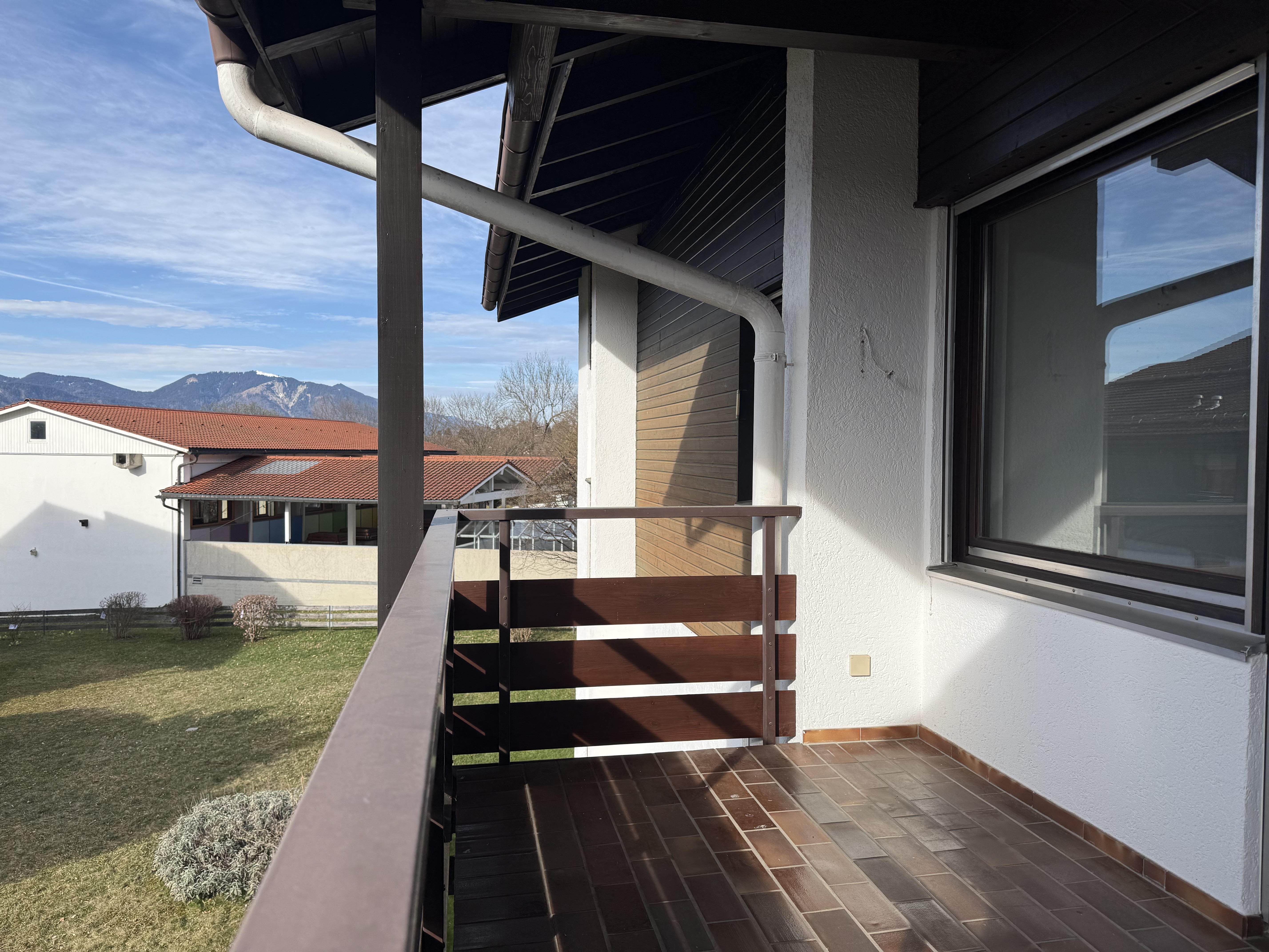 Vom Wohnbereich hat man Zugang zu dem großzügigen Süd-Balkon, der ausreichend Platz und einen herrlichen Blick auf die Parkanlage und die umliegenden Berge bietet.
