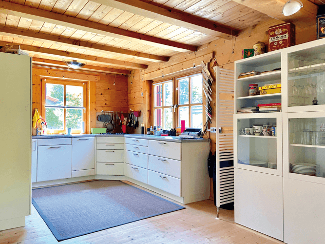 Der Wohnbereich im Erdgeschoss mit offener Küche und Essplatz ist großzügig gestaltet. Die massiven Holzwände und der Dielenboden vermitteln eine gemütliche und warme Atmosphäre mit einem tollen Raumklima. Von hier hat man auch Zugang zu der großen vorgelagerten Holzterrasse mit Glasüberdachung und elektrischer Markise.