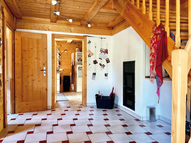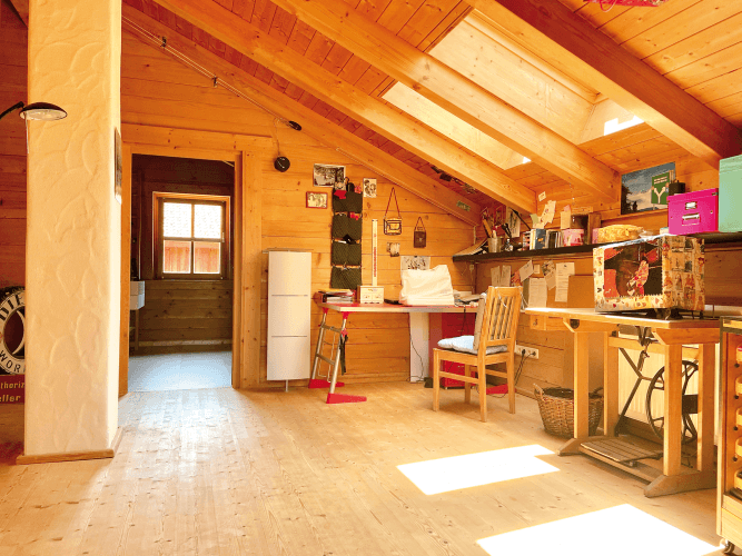 Das Herz des Hauses bildet der gemauerte Grundofen, der zentral um die Räume angeordnet ist. Befeuert wird er von der gro.zügigen Diele aus. Über eine schöne Holztreppe erreicht man das luftig hohe Dachgeschoss. Zwei Dachflächenfenster lassen viel Licht hinein in den offenen Arbeits- und Wohnbereich. Sowohl von hier als auch vom Schlafzimmer aus hat man Zugang zum Westbalkon. Das Badezimmer wurde erst 2019 geschmackvoll neu gestaltet. Von hier erreicht man das angrenzende Ankleidezimmer, in dem auch die Gas-Heizung untergebracht ist. Das Haus ist nicht unterkellert. Abstell- und Staumöglichkeiten hat man im Lager- und Geräteraum (auch als Werkstatt nutzbar) hinter dem Carport, der direkt an das Haus angrenzt. Zwei Außenstellplätze stehen zusätzlich auf dem Grundstück zur Verfügung.